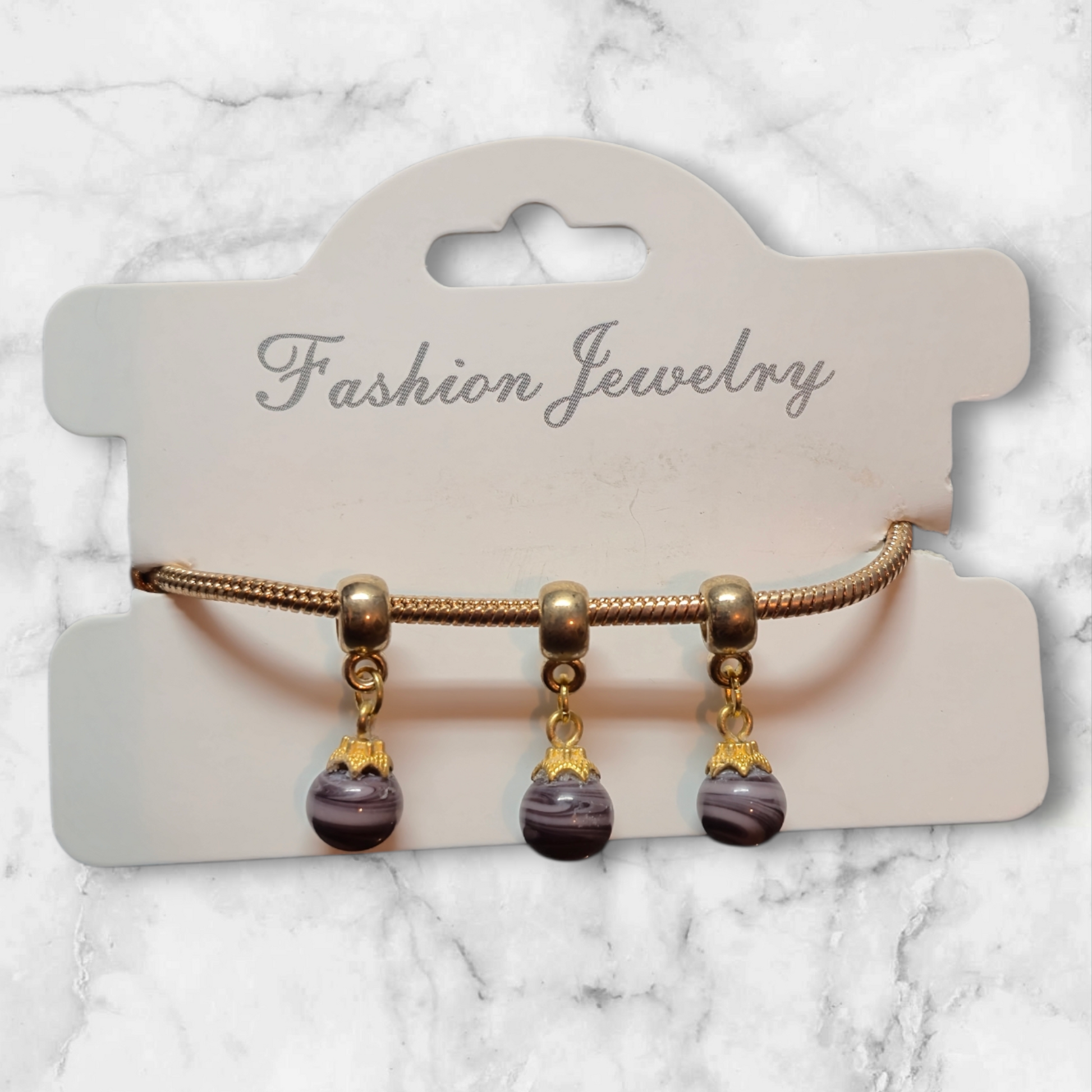 Goldfarbendes Edelstahl Armband mit 3 lila Perlen
