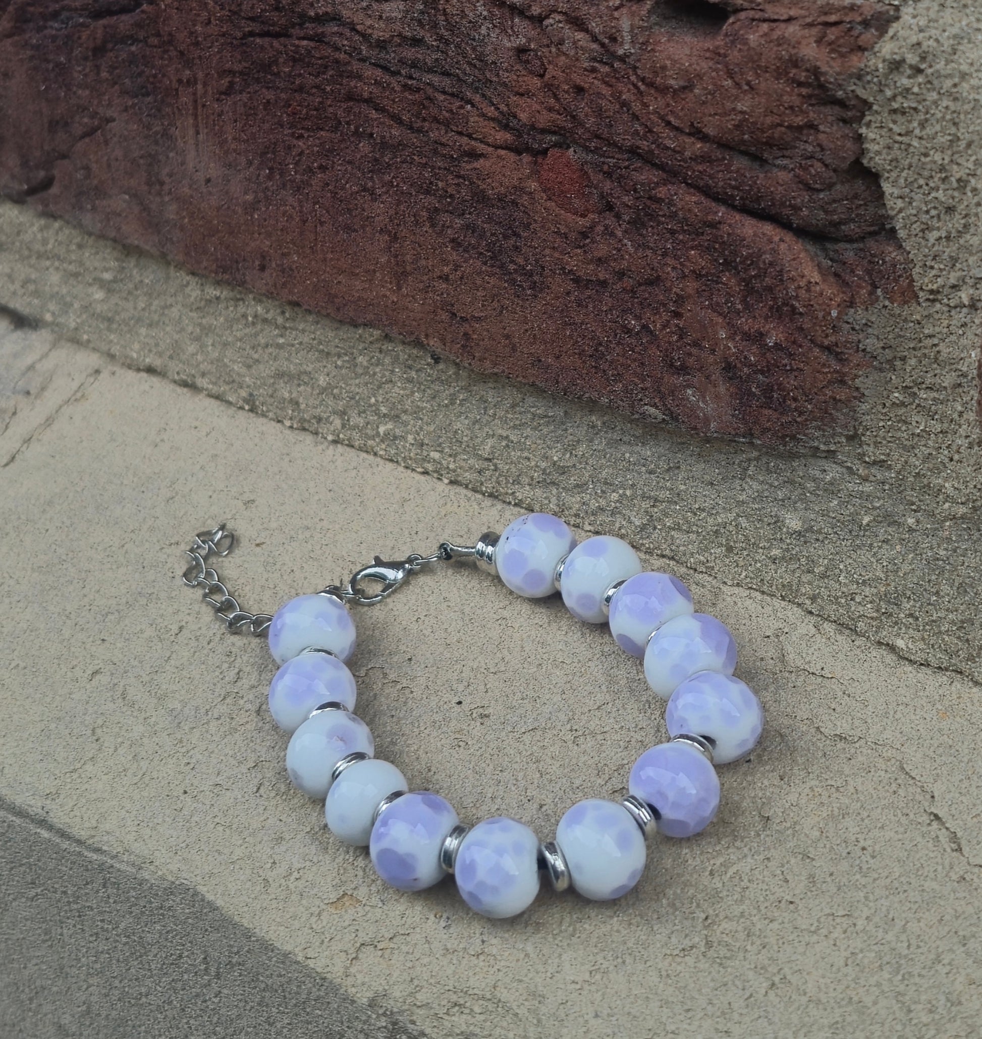 Weißes Armband mit lila Akzenten und silbernen zwischen Perlen in der Länge 18 cm bis 23 cm. Wer möchte kann sich beim Punkt „Zubehör“ auch noch einen Buchstaben aussuchen und ich setze den Buchstaben vor dem Versand noch an dein Armband dran.