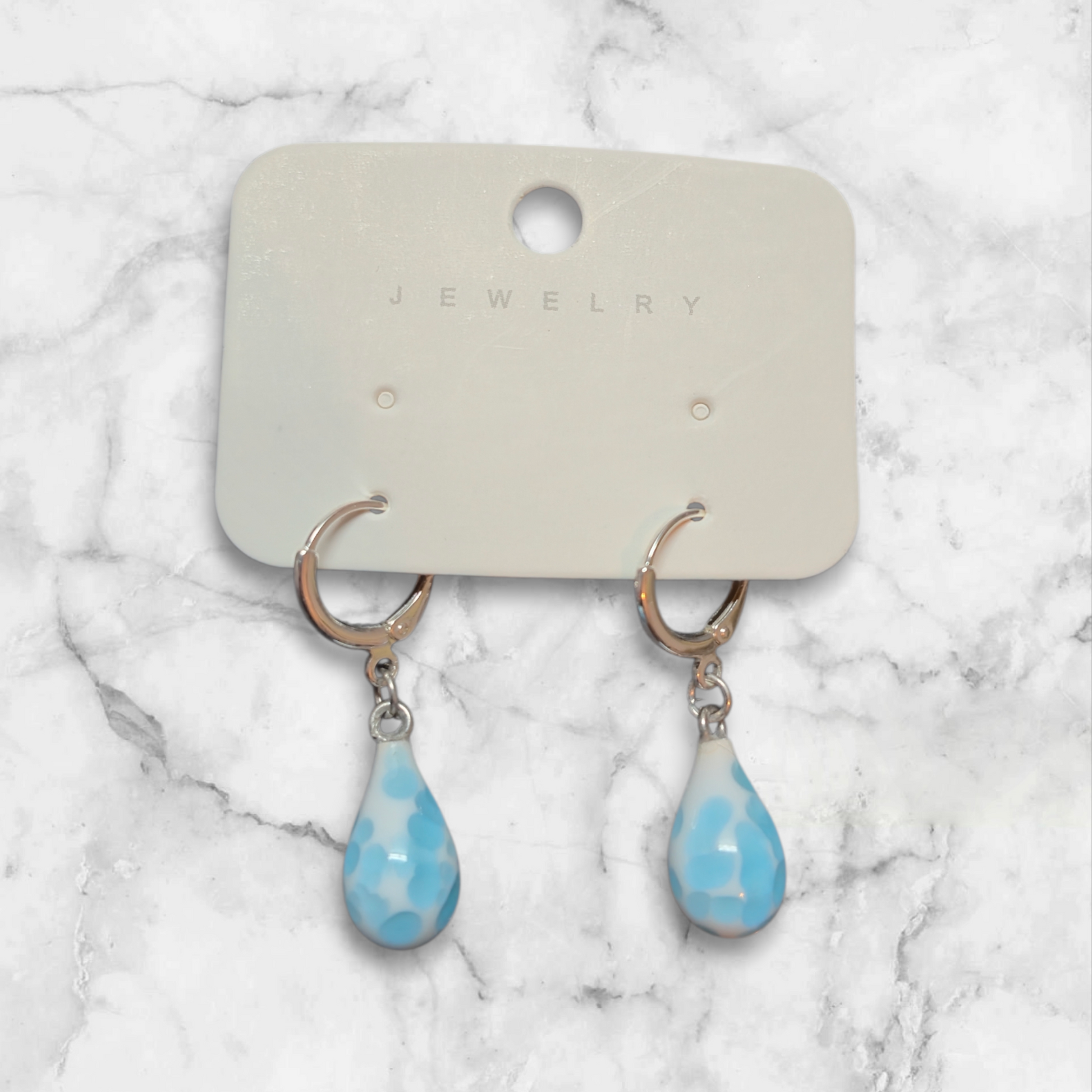 Weiße Creolen mit blauen Flecken. Die Creolen sind aus 925er Silber