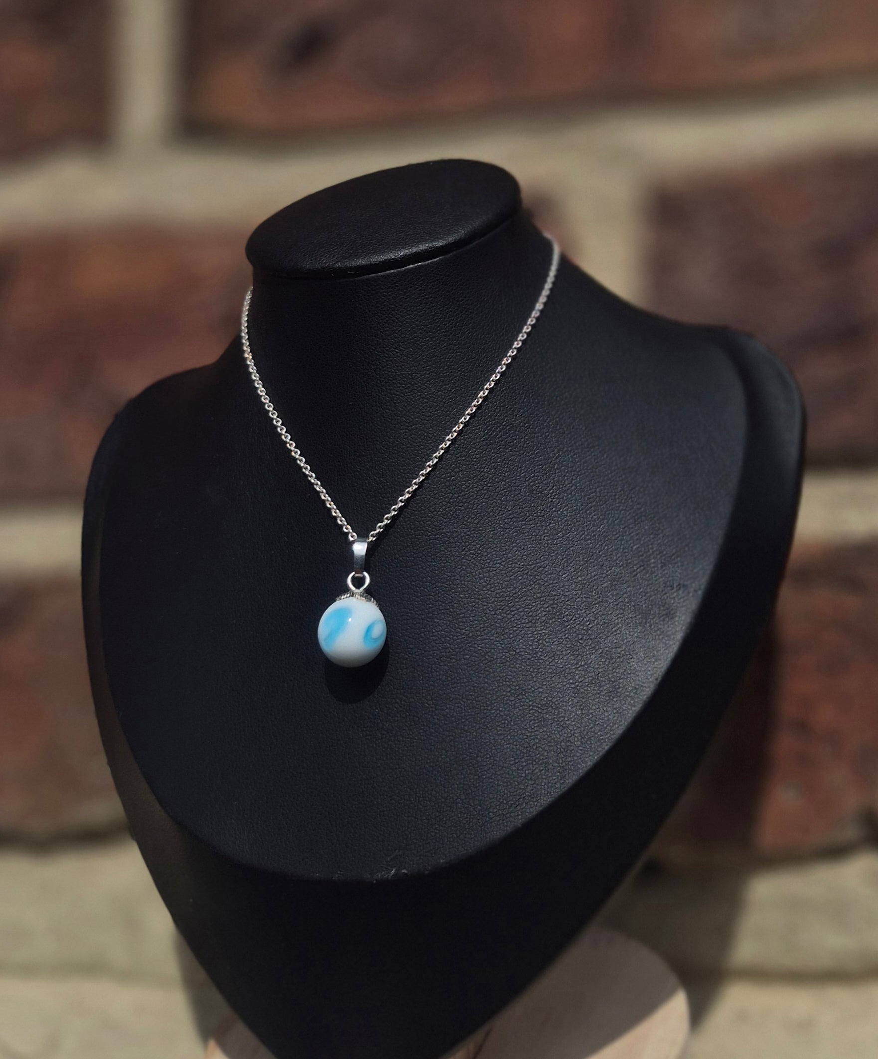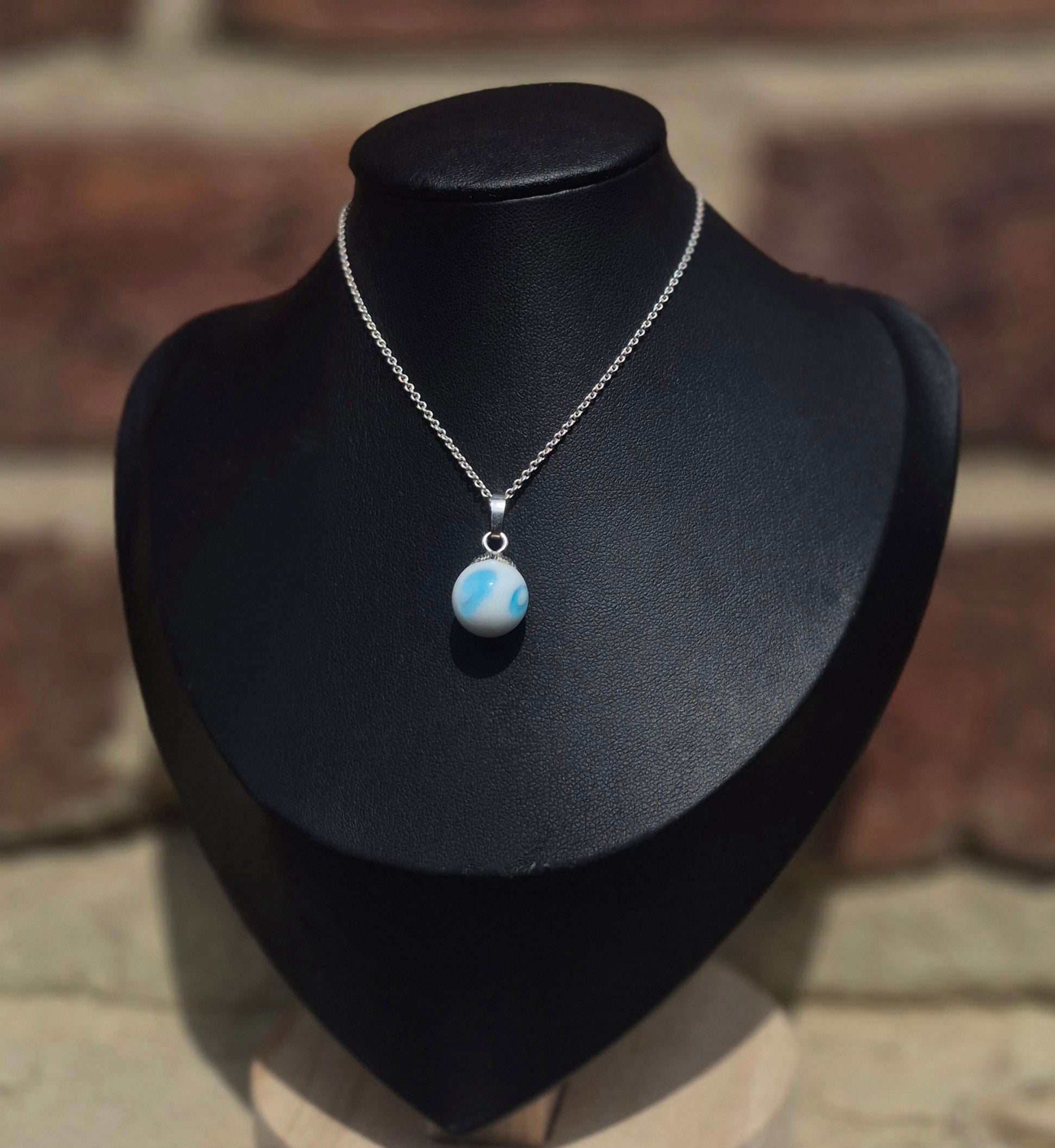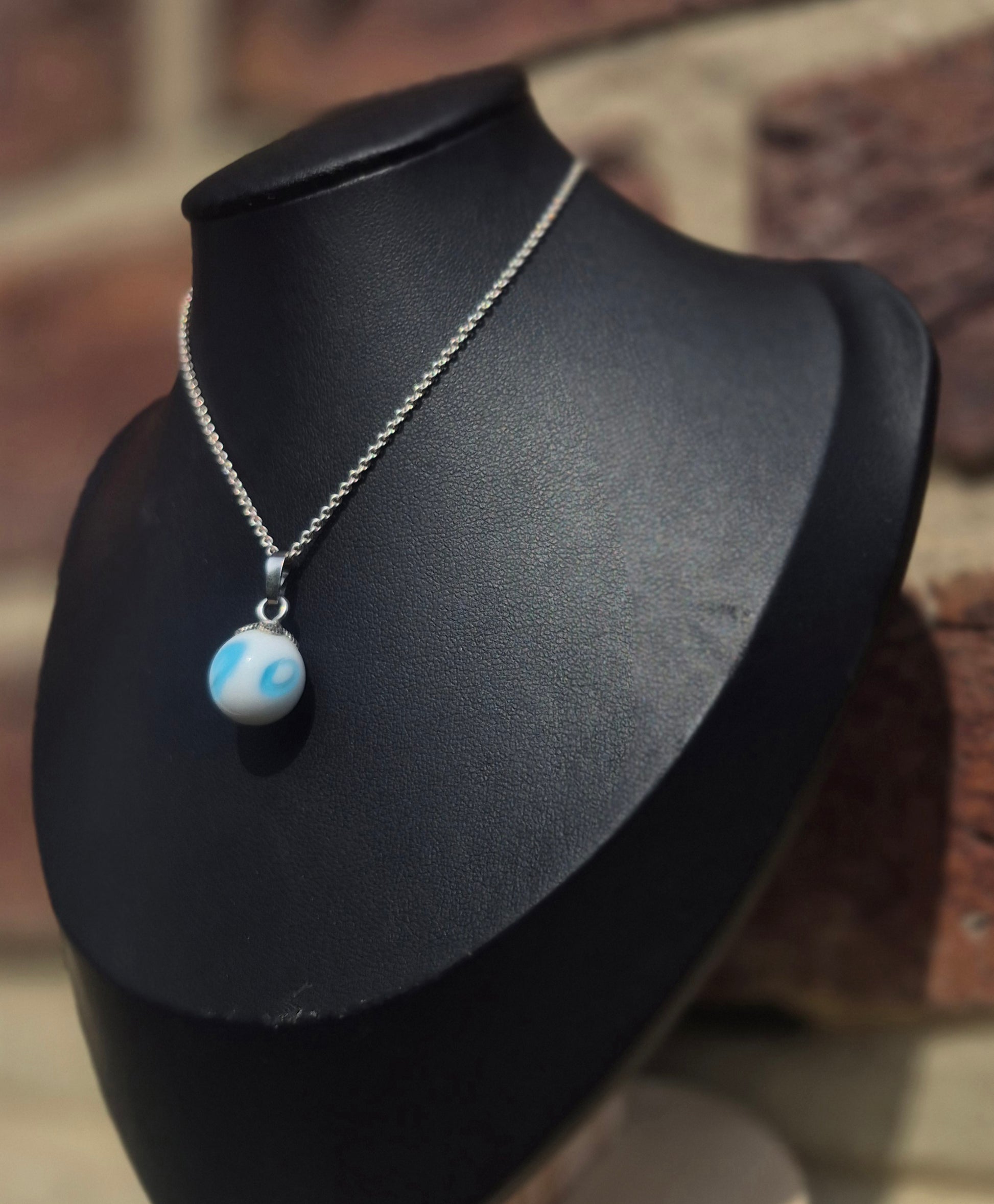 Weißer Kugel Anhänger mit blau transparenten Glasflecken (ohne Kette). Ketten gibt es unter dem Punkt Zubehör