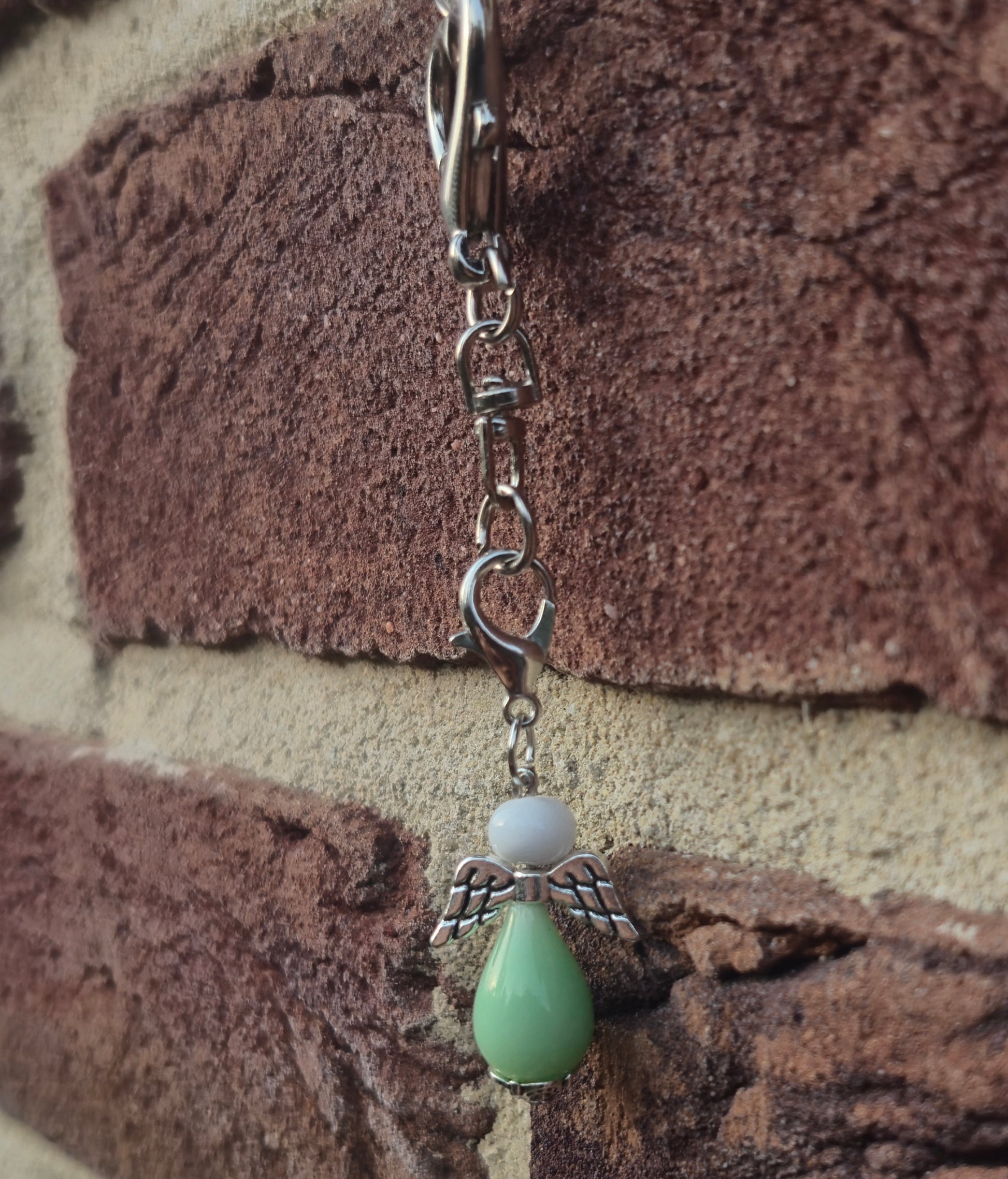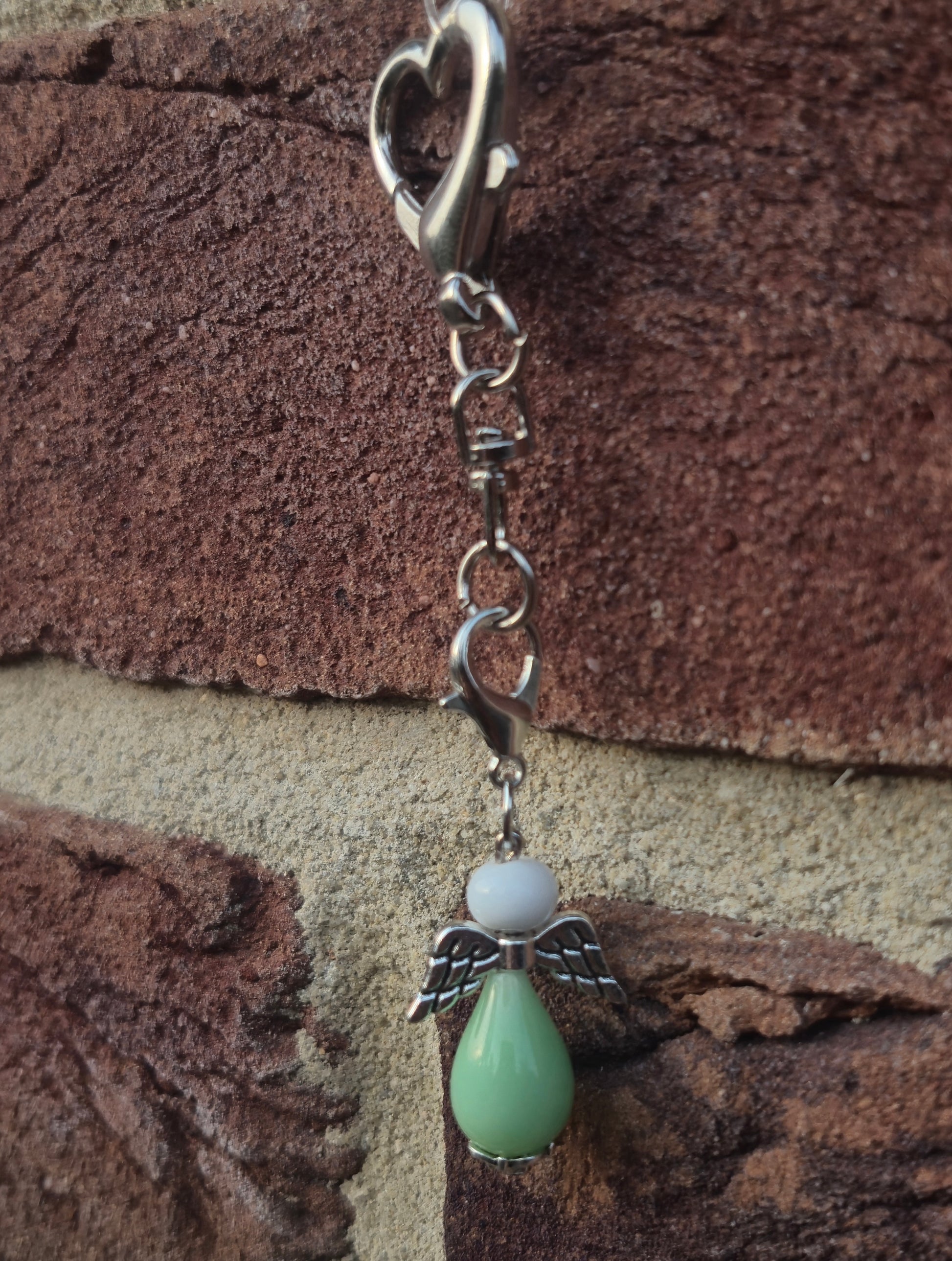 Grünlich, weißer Engel Taschen- und Schlüsselanhänger.(ohne den Herz Schlüsselanhänger)Also nur die Engel Perle. Der Herz Schlüsselanhänger findet man unter dem Punkt Zubehör.