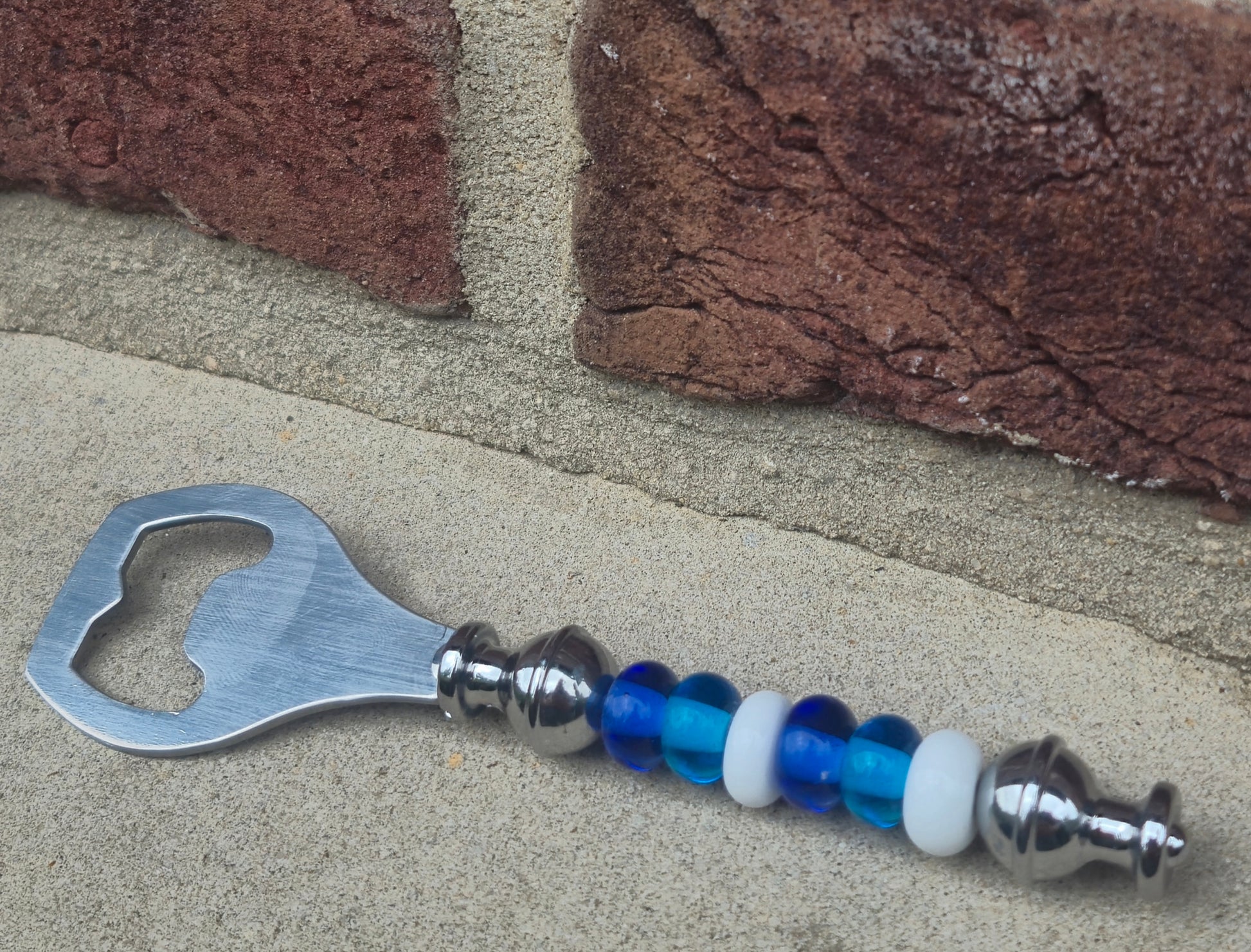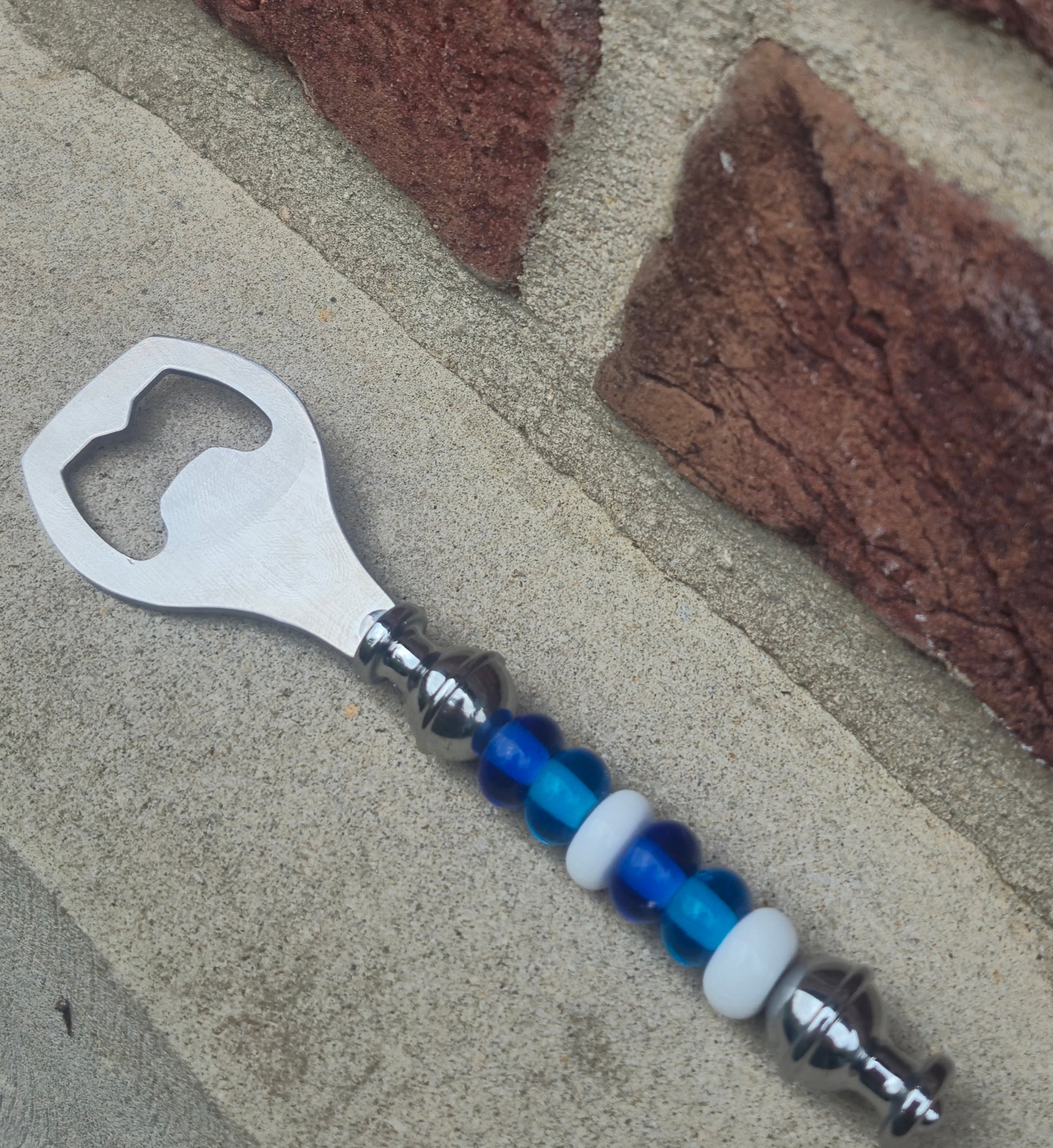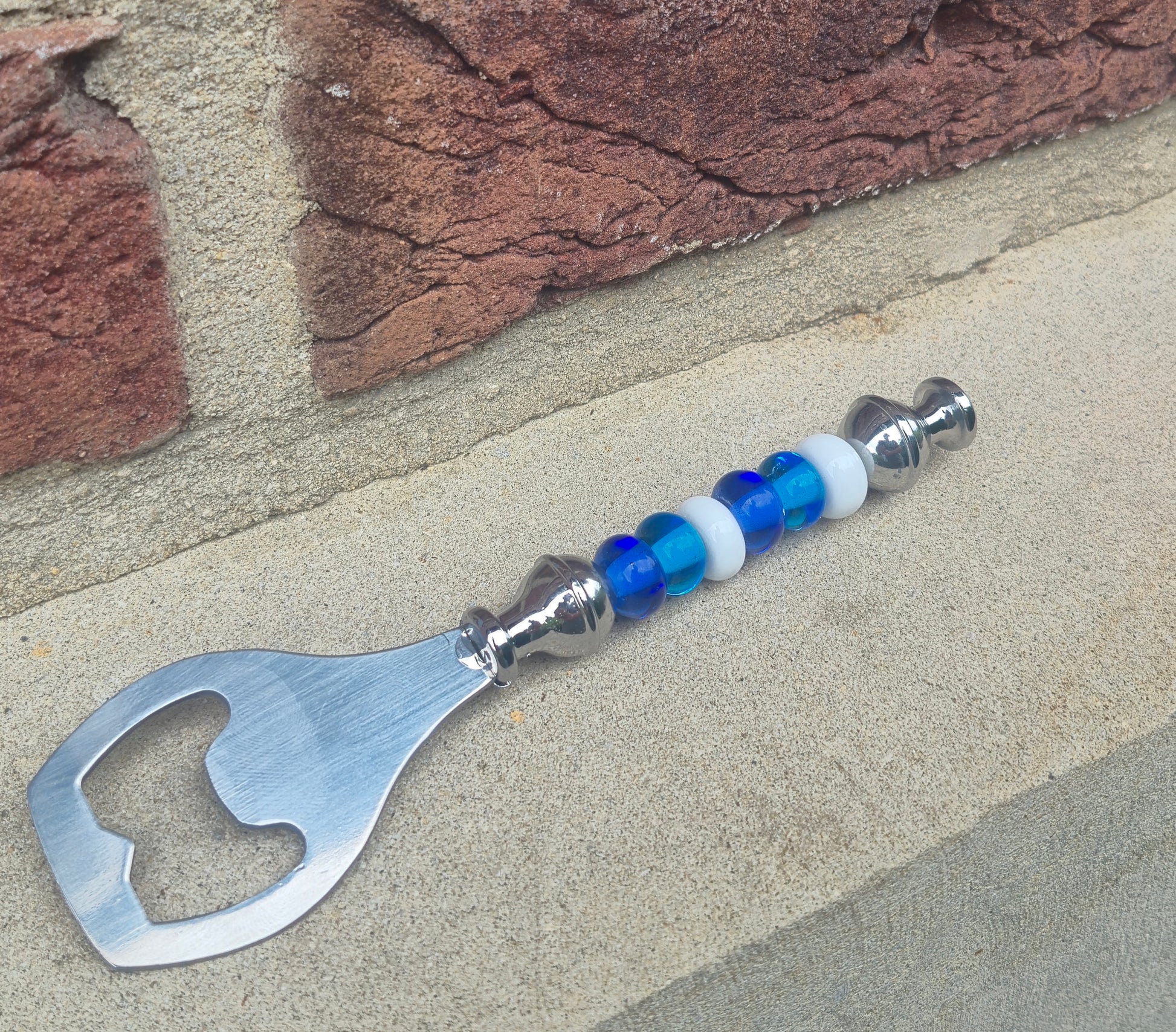 Flaschenöffner mit blauen Transparenten und weißen Glas