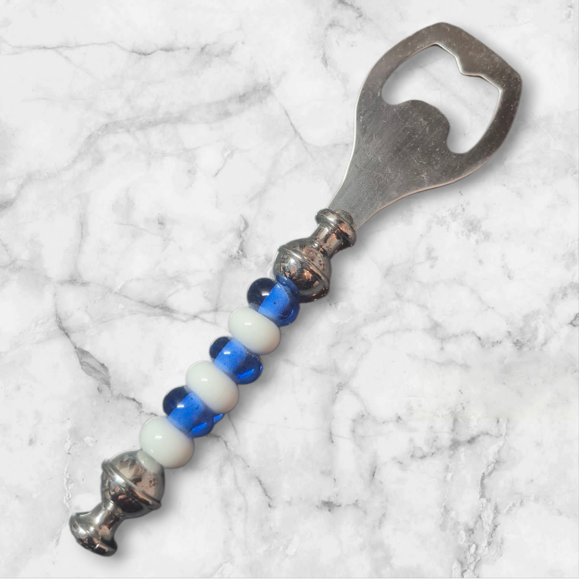 Flaschenöffner mit weißen und Transparenten blauen Perlen