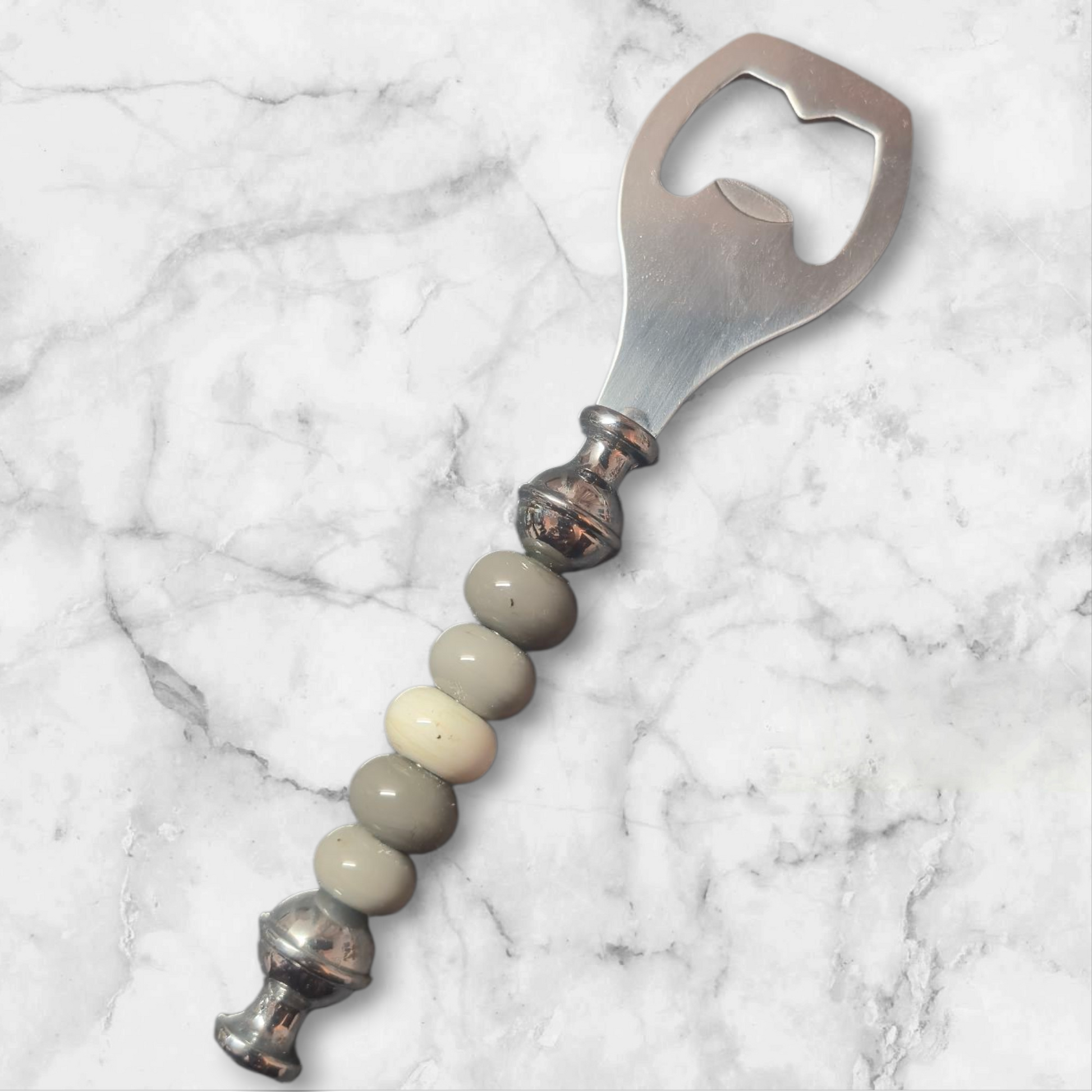 Flaschenöffner mit dunkel und hell grauen Glasperlen und einer creme farbenden Perle