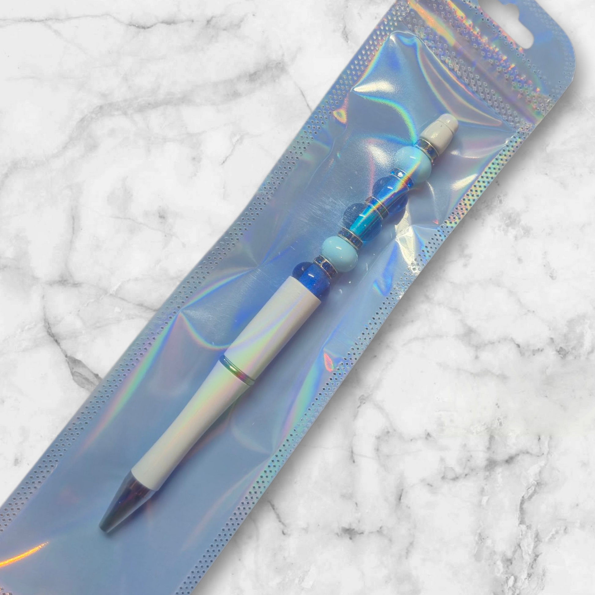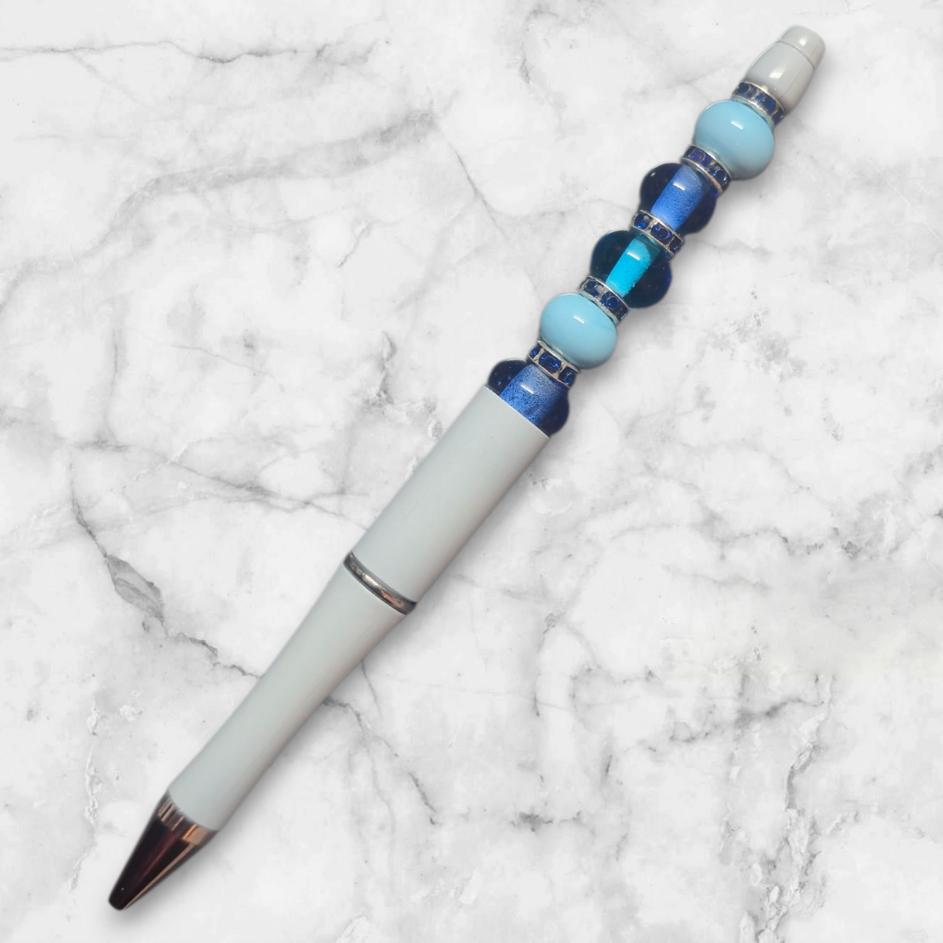 Weißer Kugelschreiber mit hellblauen und Transparenten blauen Glasperlen . Die Mine ist schwarz.Ersatz Minen gibt es bei mir unter dem Punkt Zubehör.