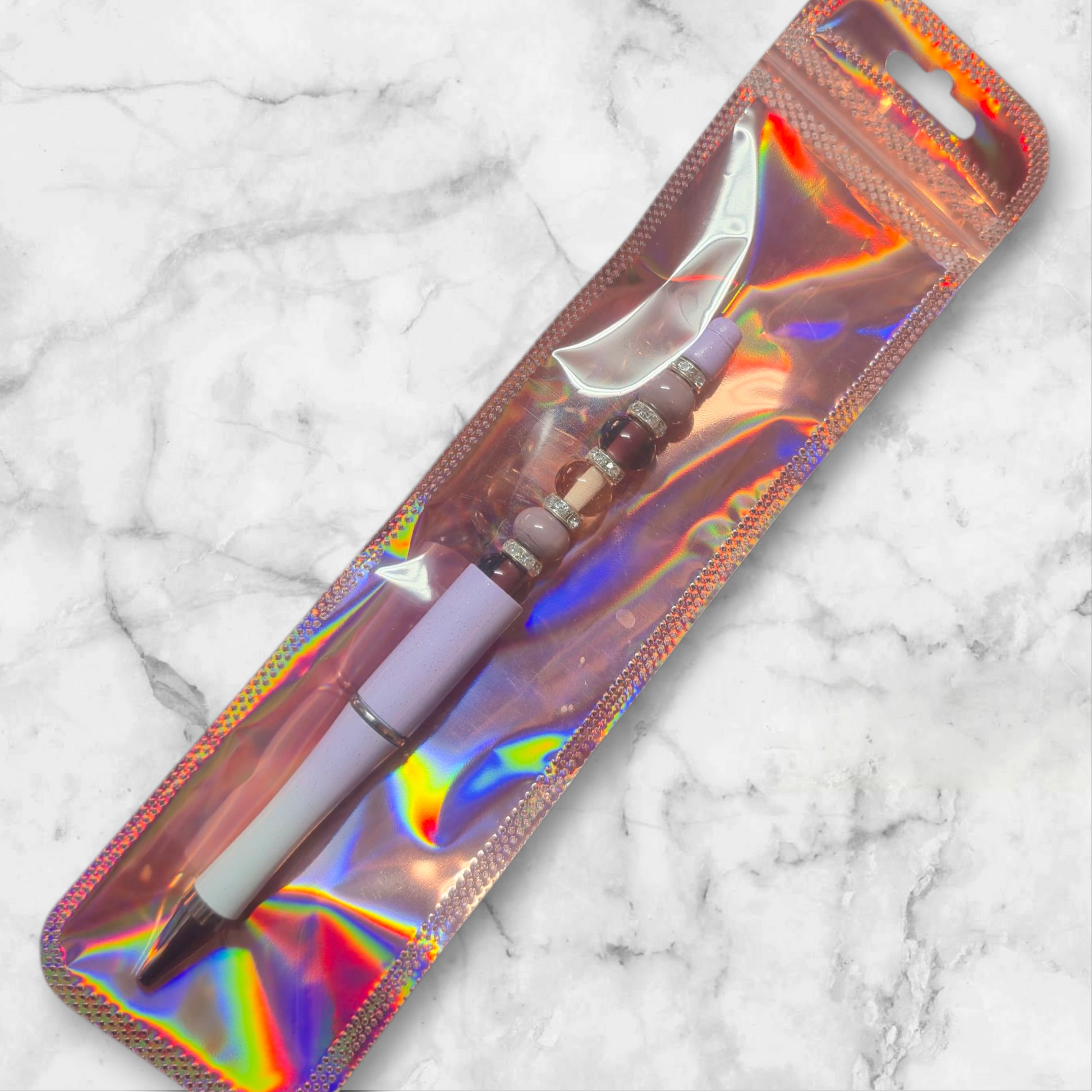 Lila qeißer Kugelschreiber mit schwarzer Mine und lila Perlen. Ersatz Minen gibt es bei mir unter dem Punkt Zubehör.