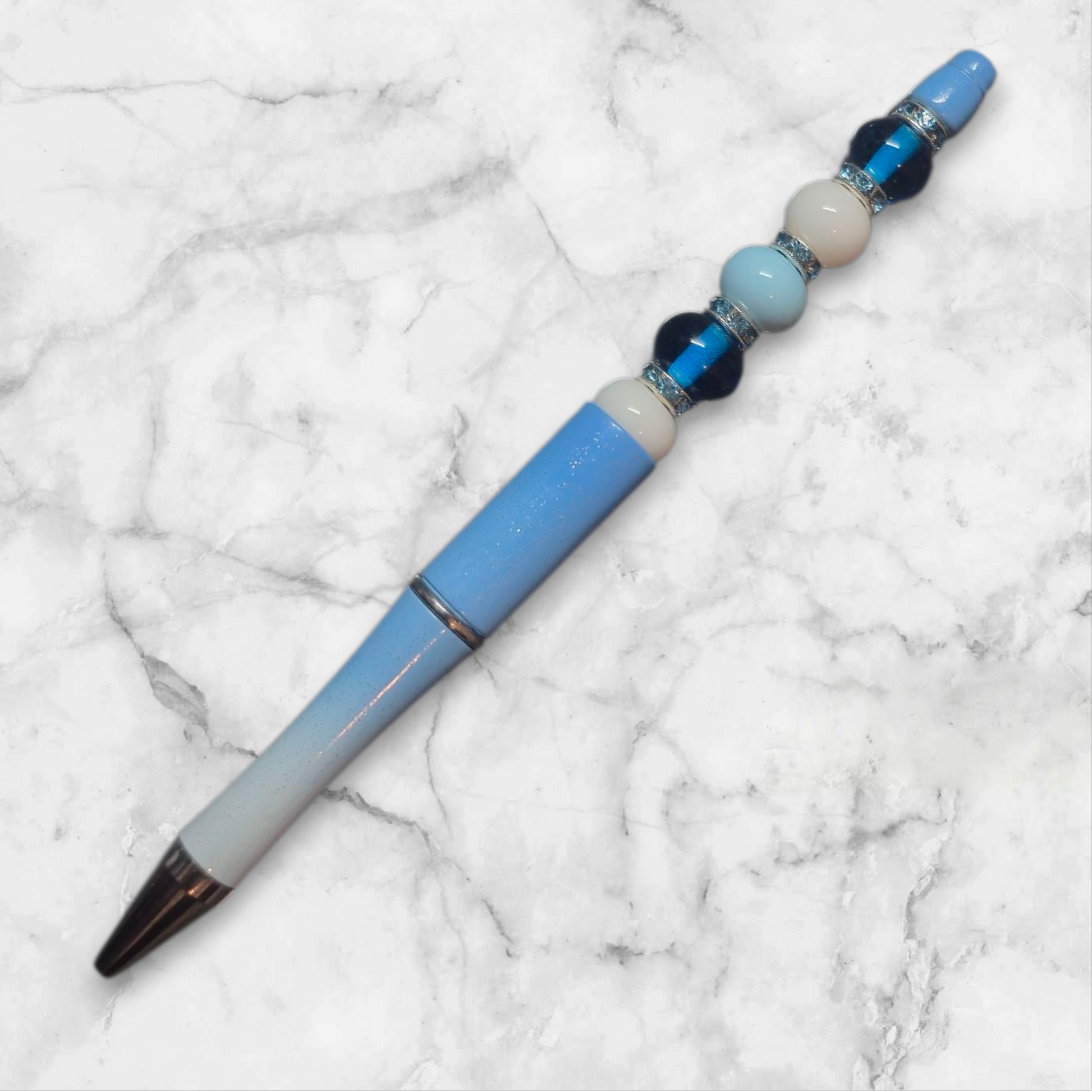 Blau weißer Kugelschreiber mit schwarzer Mine mit weiß ,hellblauen und dunkel blau transparenten Perlen. Ersatz Minen gibt es bei mir unter dem Punkt Zubehör.