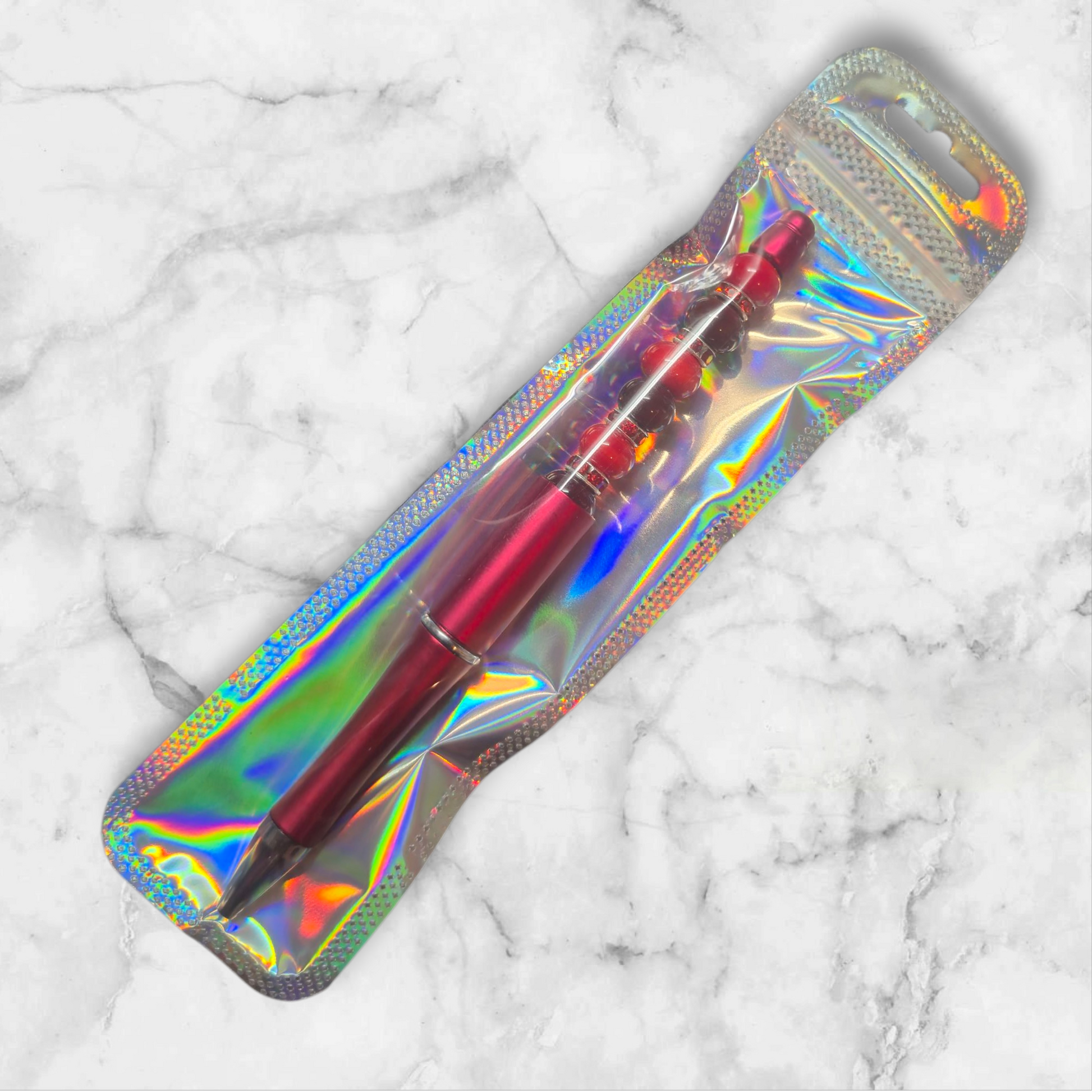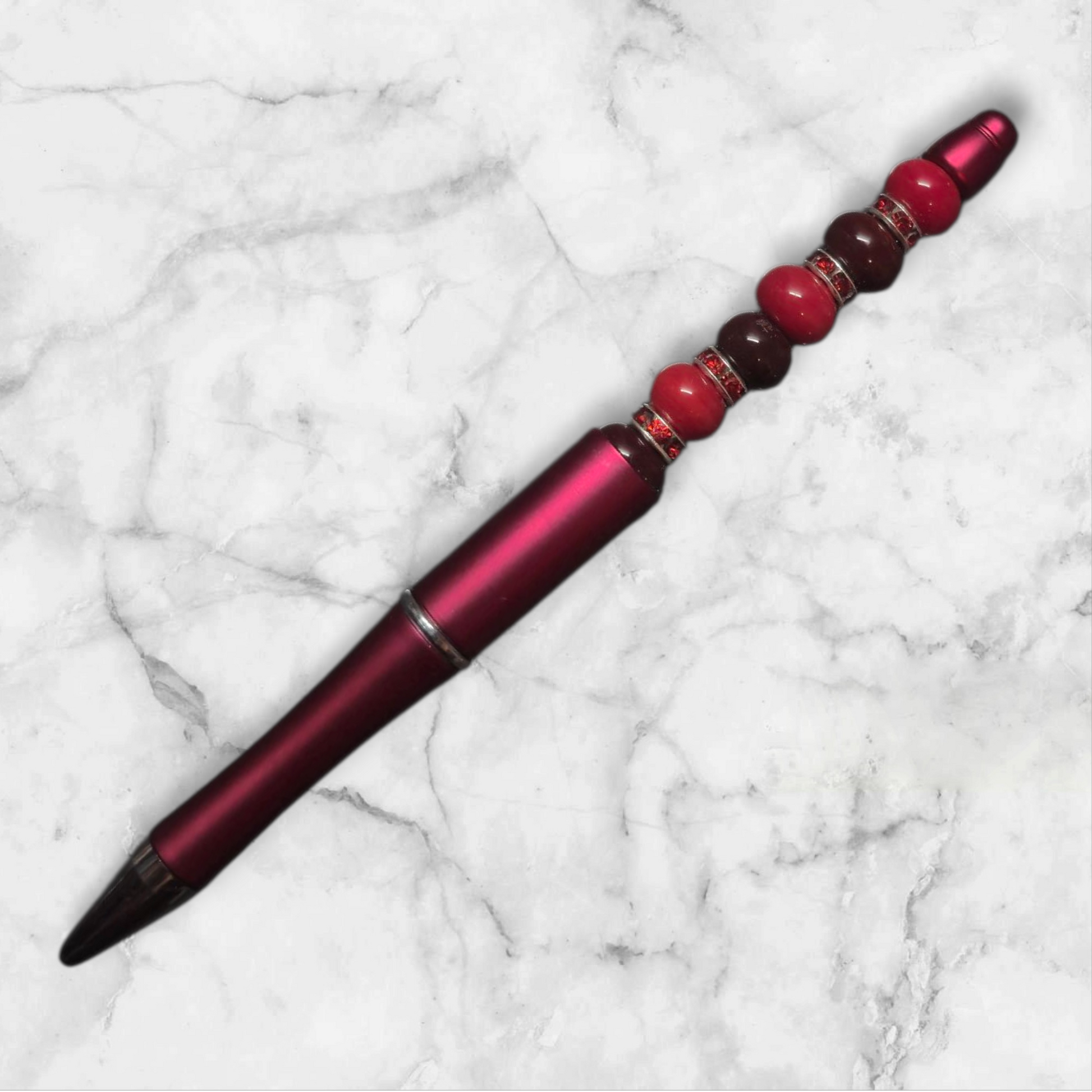 Rot metalischer Kugelschreiber mit schwarzer Mine und roten und dunkel roten Perlen. Ersatz Minen gibt es bei mir unter dem Punkt Zubehör.