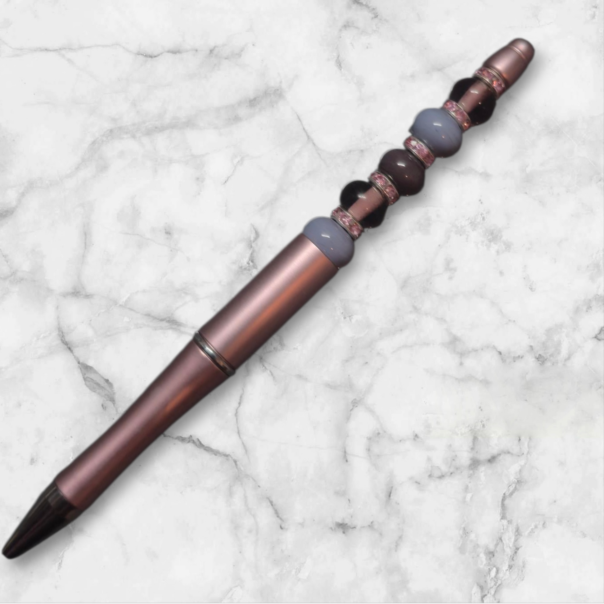 Pinker Kugelschreiber mit lila und transparenten lila Perlen. Ersatz Minen gibt es bei mir unter dem Punkt Zubehör.