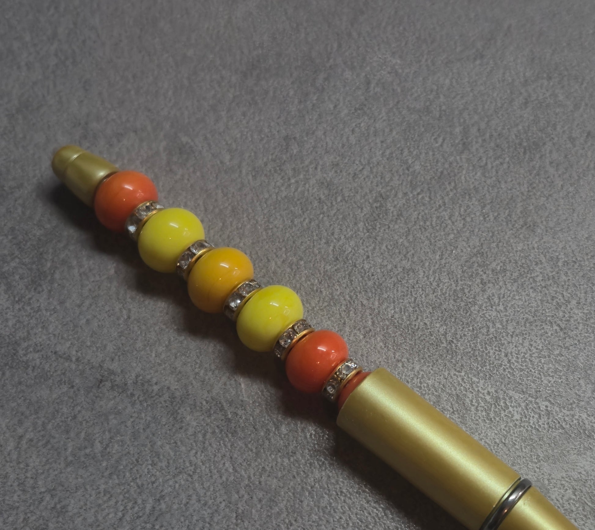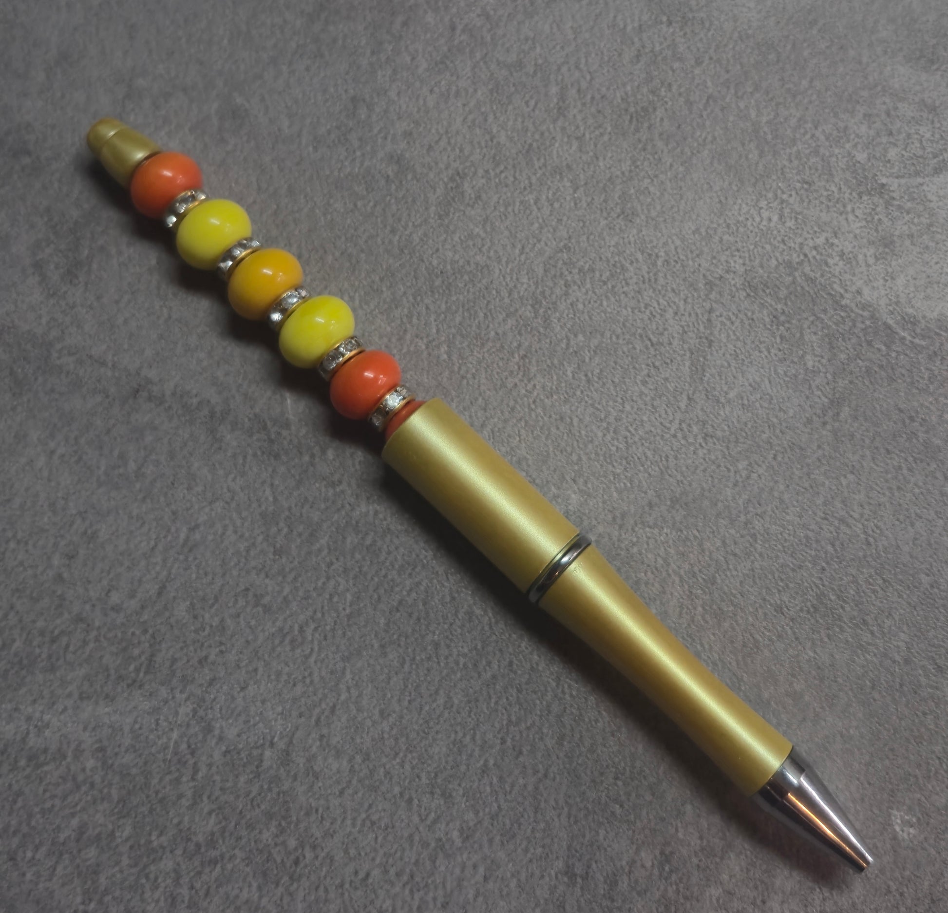 Goldener Kugelschreiber mit gelben orangenen Perlen und schwarzer Mine