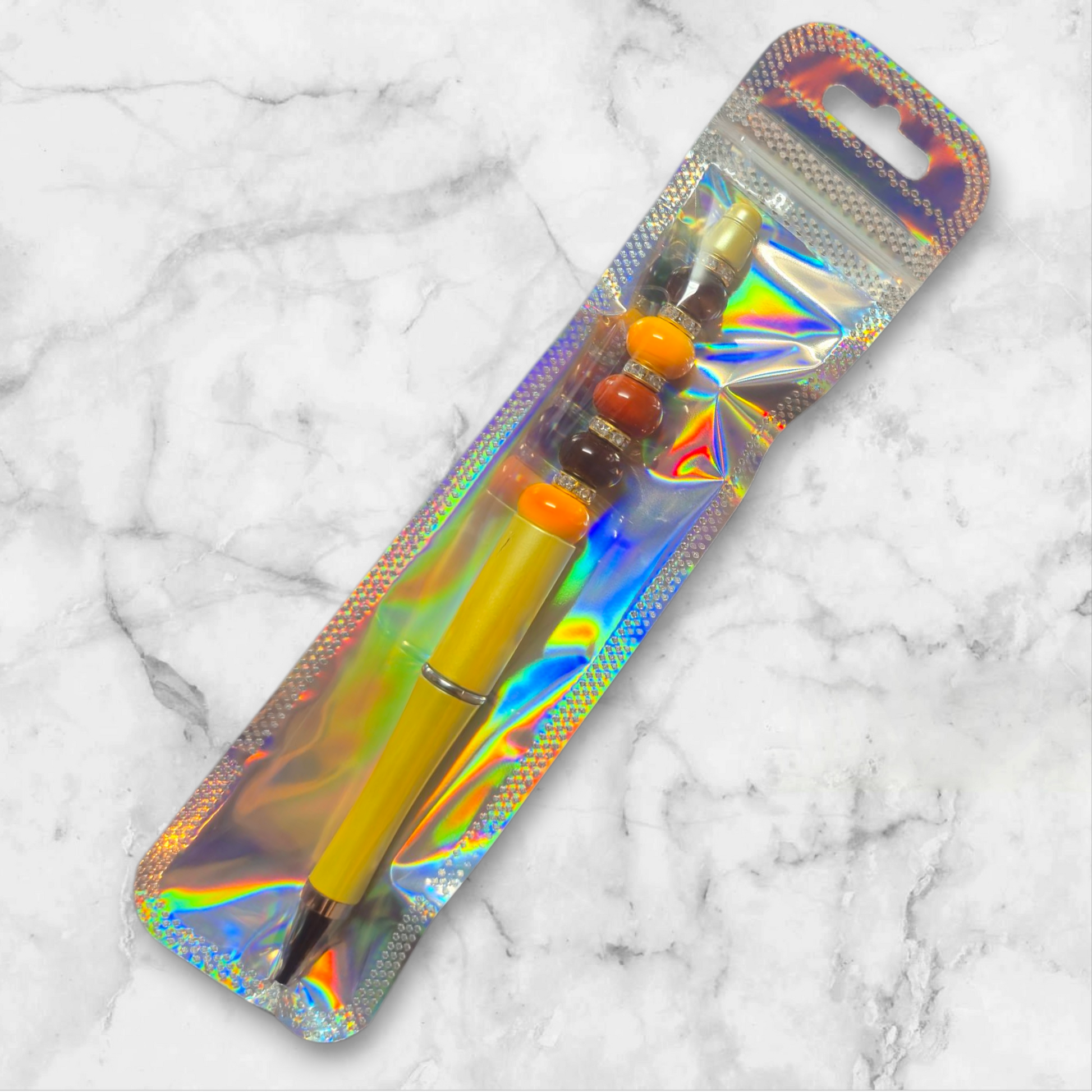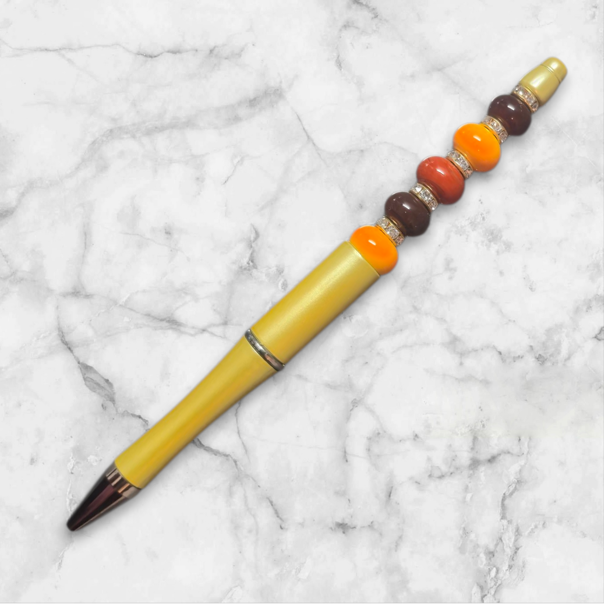 Goldener Kugelschreiber mit braunen und orangenen Glasperlen. Die Mine ist schwarz. Ersatz Minen gibt es bei mir unter dem Punkt Zubehör.