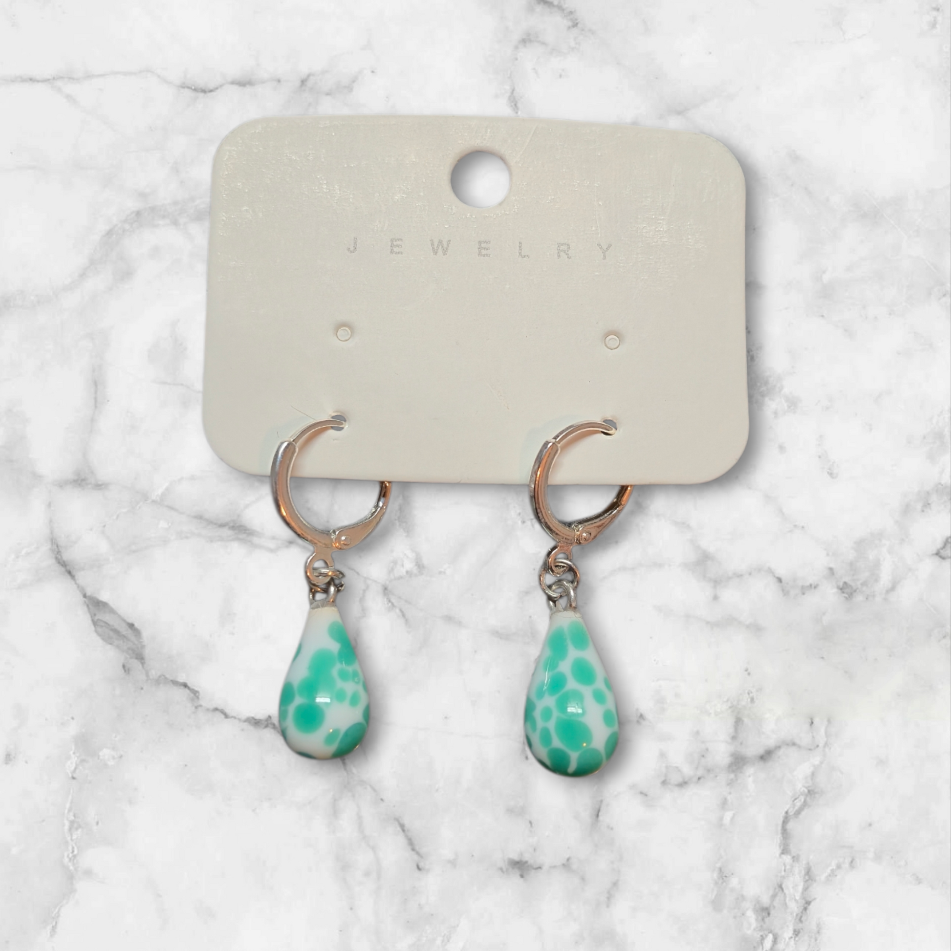 Weiße Creolen mit grün türkisen Flecken. Die Creolen sind aus 925er Silber