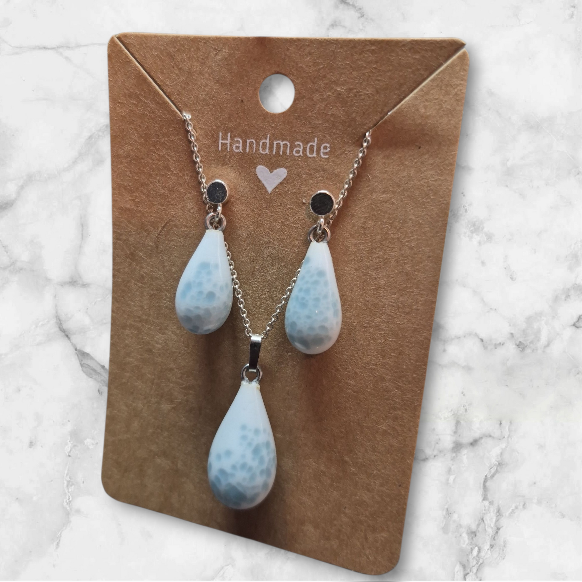 Weißes Tropfen Anhänger Ketten und Ohrring set mit blauen Flecken. Kette und Ohrringe sind aus 925er Silber