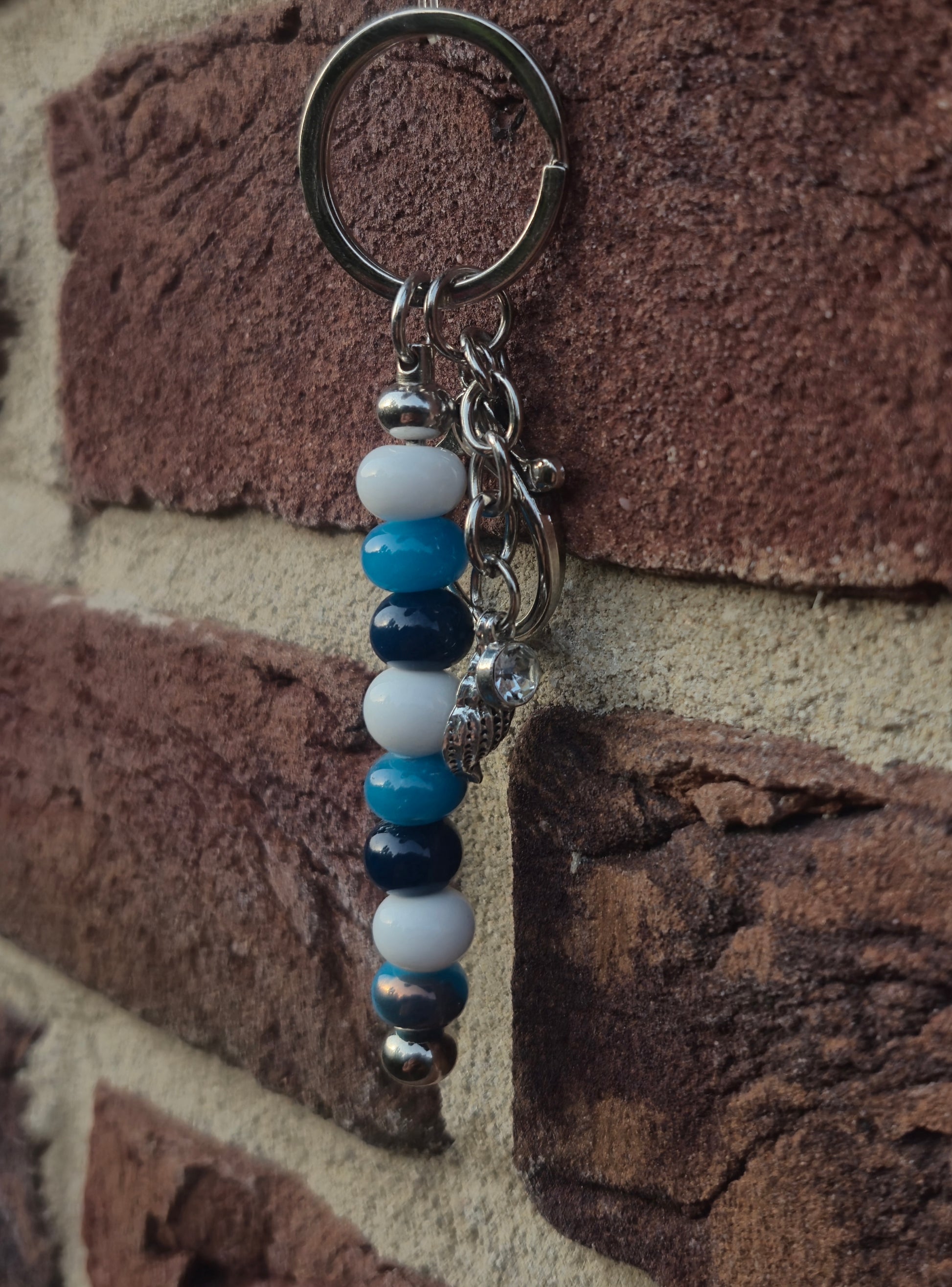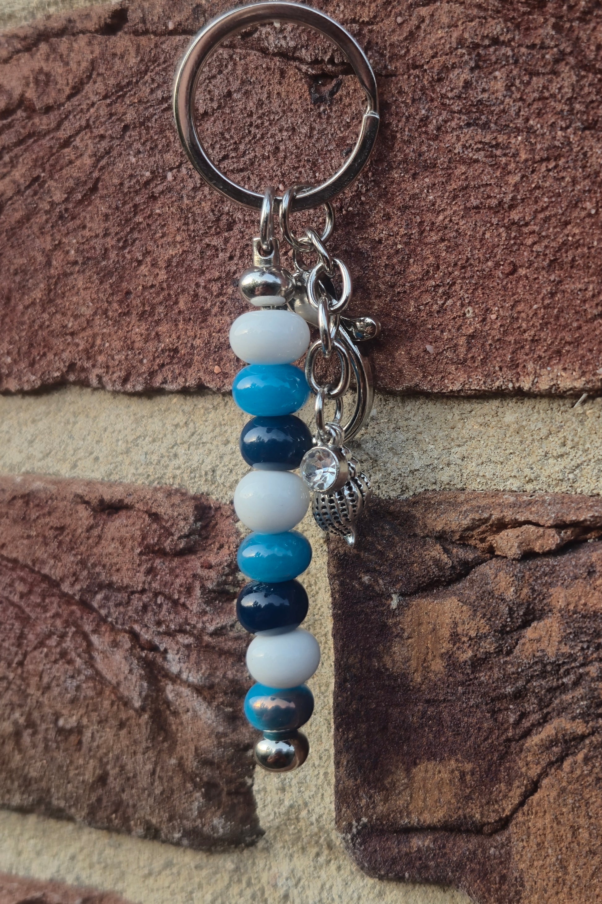Stab Schlüsselanhänger mit blauen und weißen Perlen und Muschel charm und glitzer Steinchen