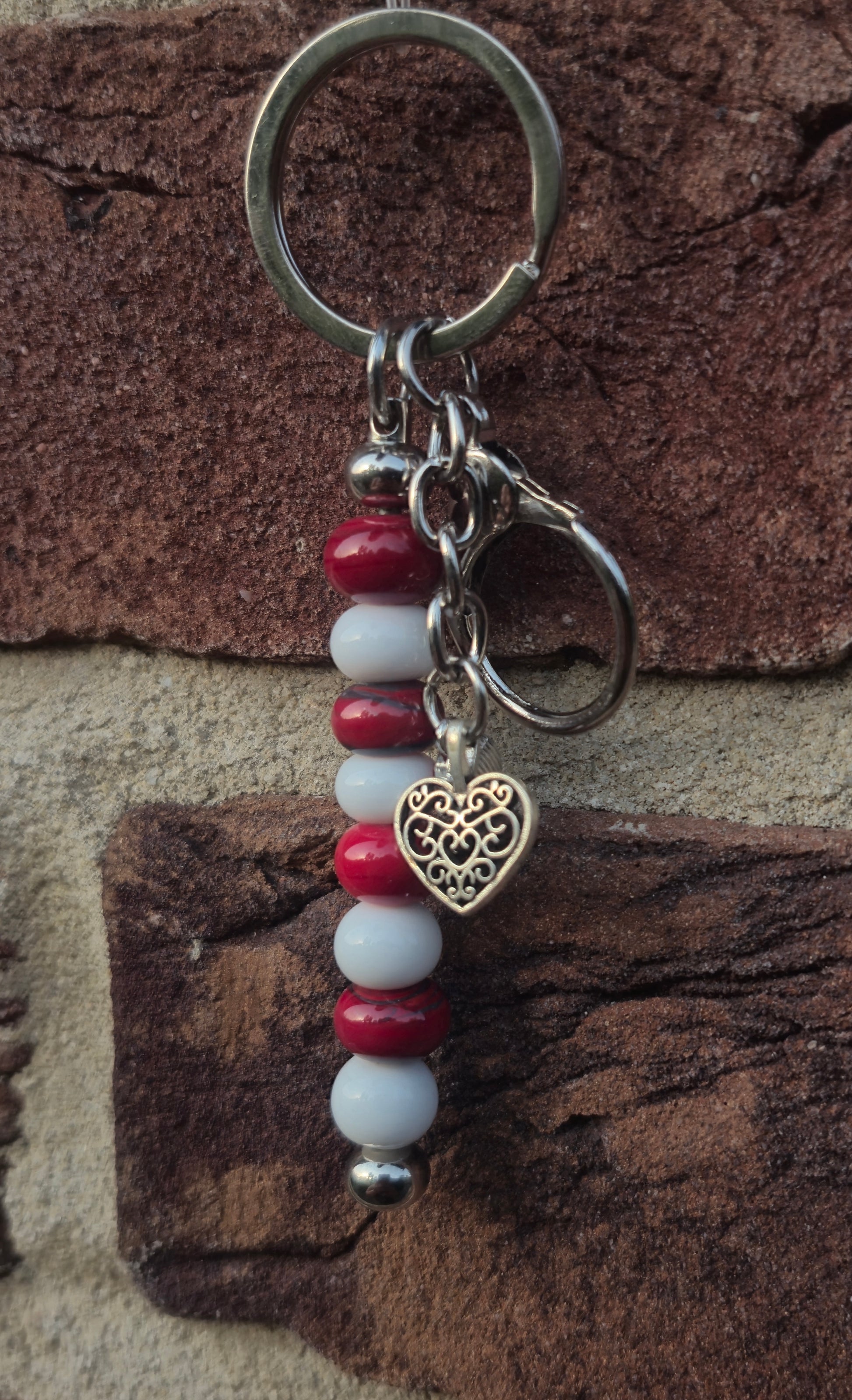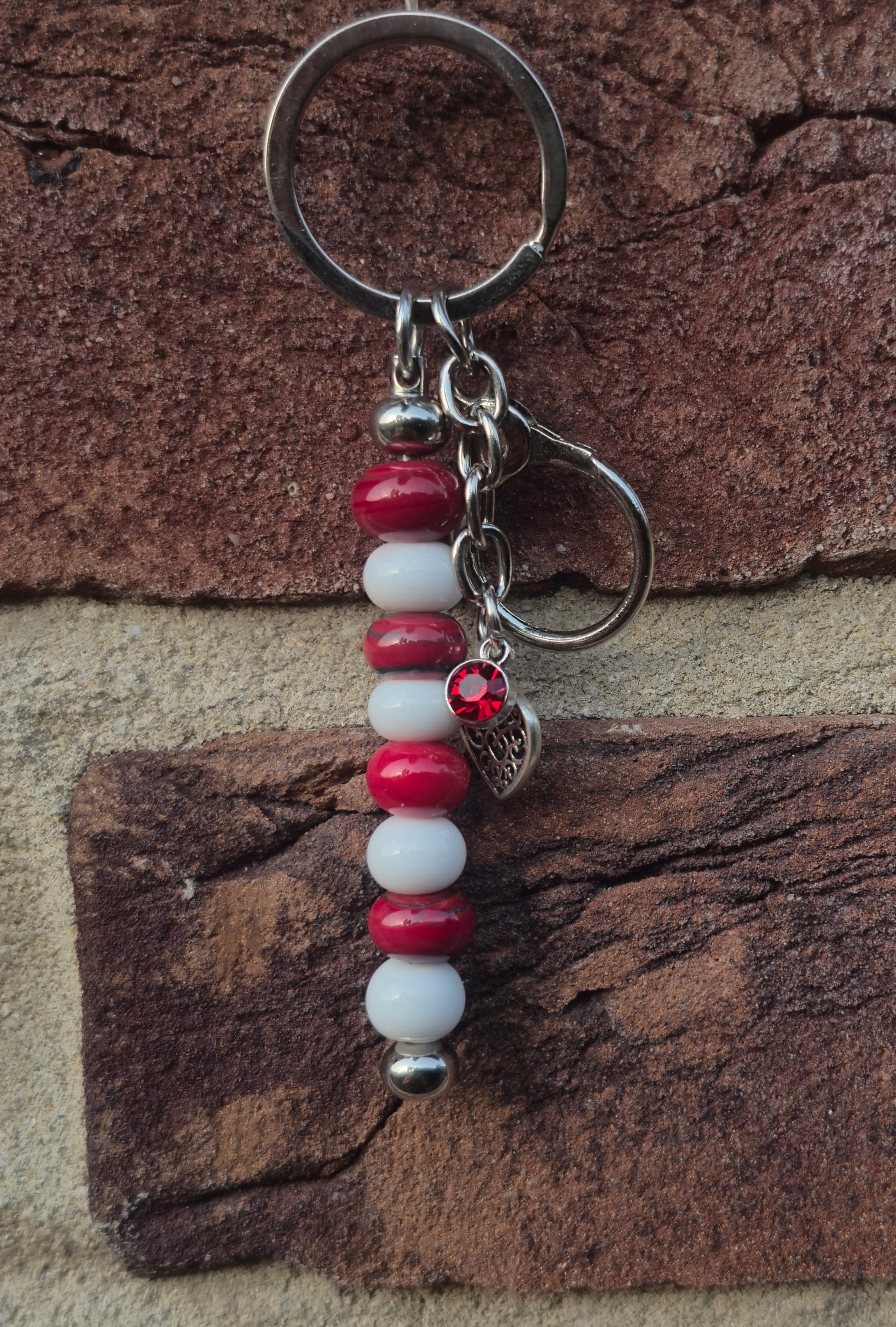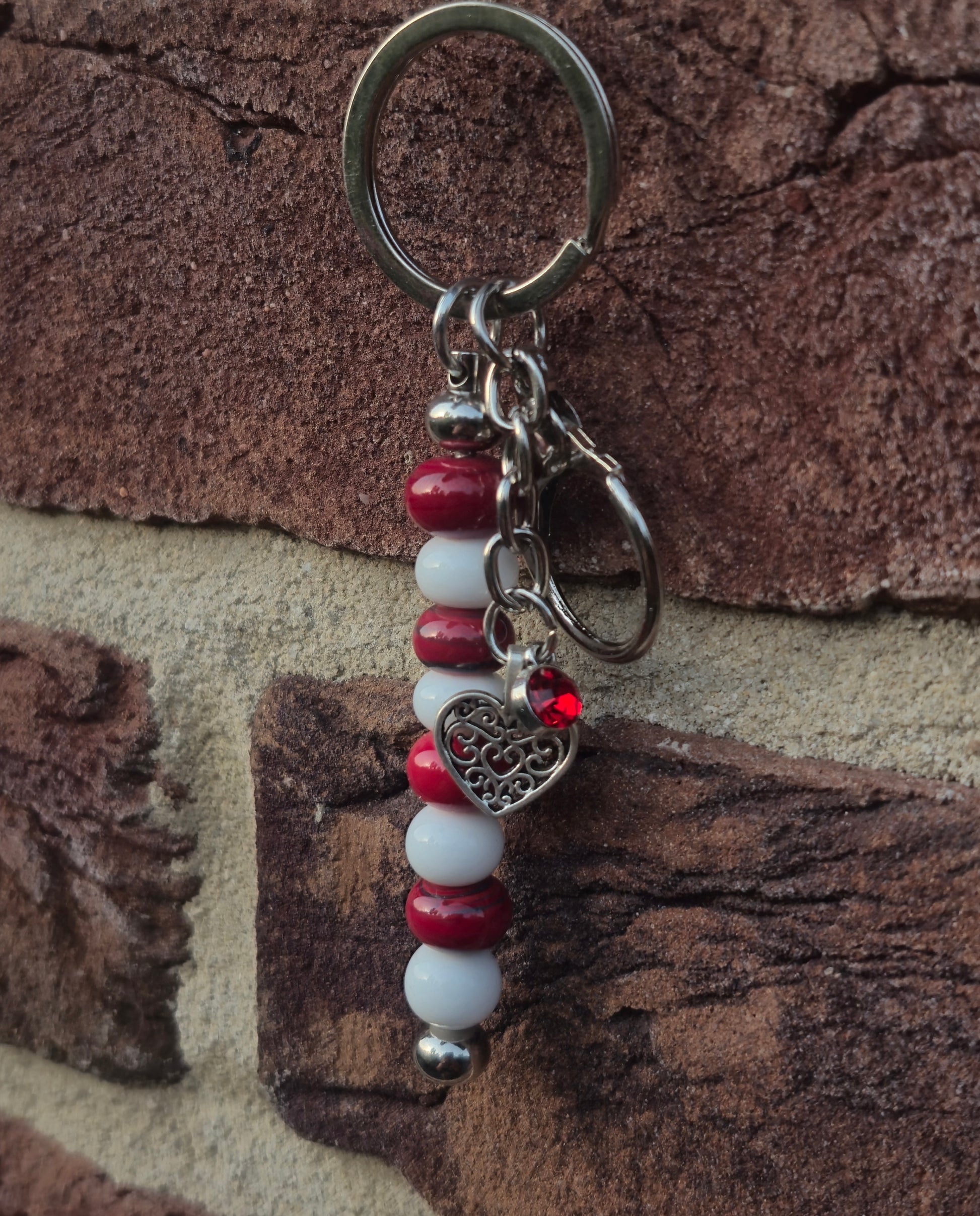 Stab Schlüsselanhänger mit roten und weißen Perlen mit Herz charm und glitzerstein