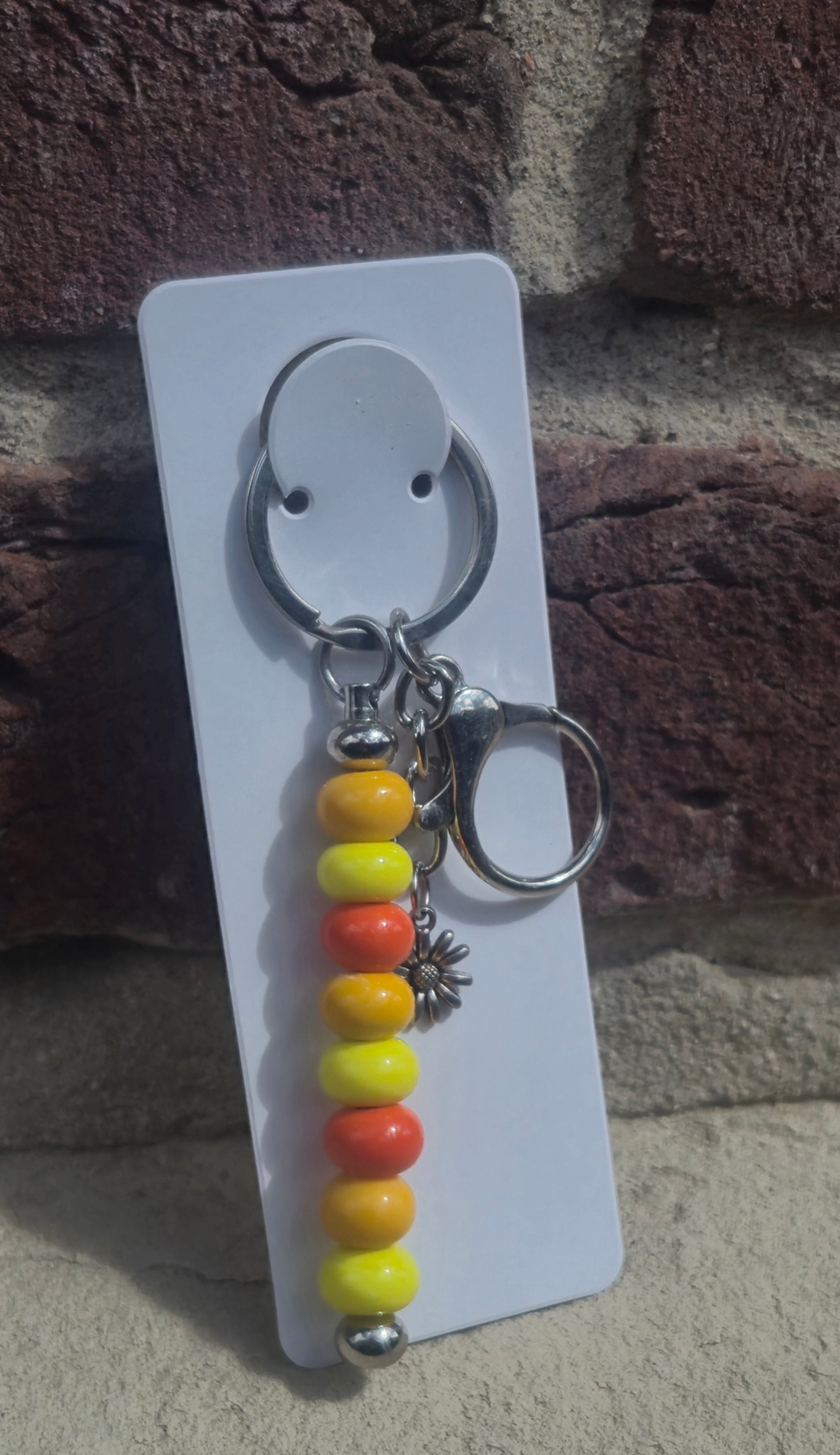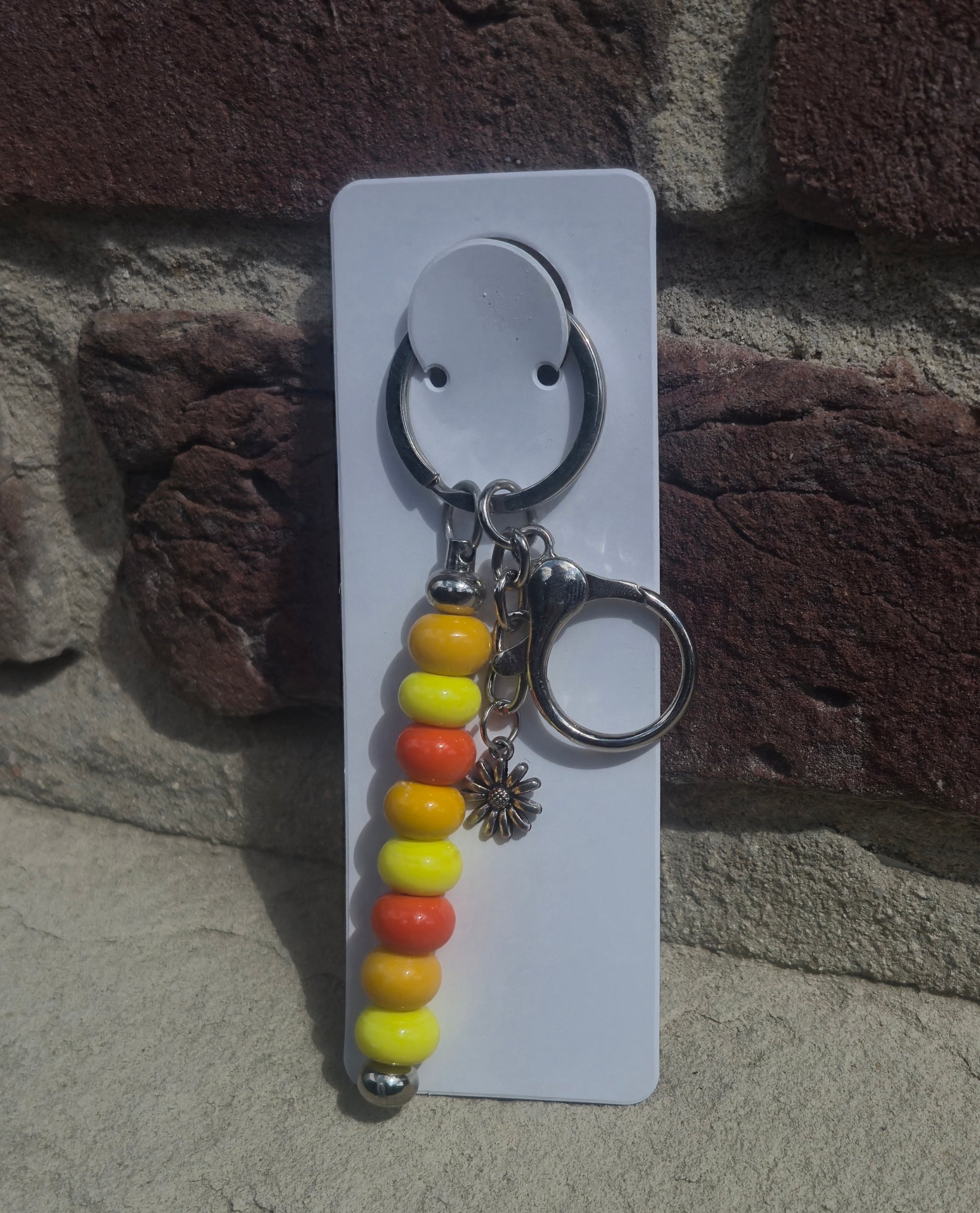 Orange gelber Stab Schlüsselanhänger mit Blumen Charm und Haken.