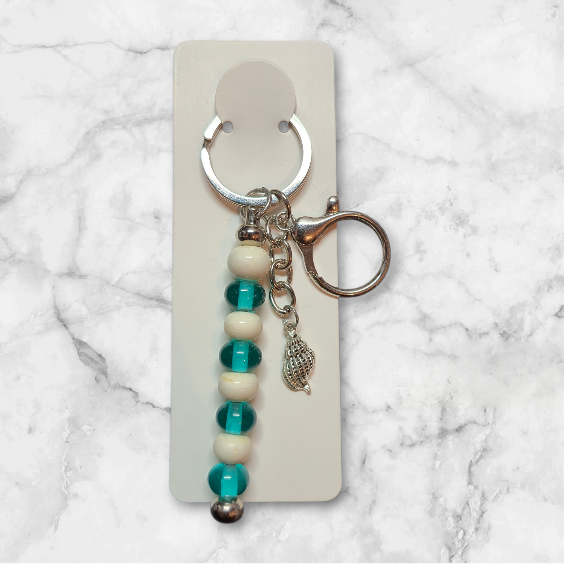 Stab Schlüsselanhänger mit creme farbenden und türkis durchsichtigen Glasperlen mit Muschel Charm.