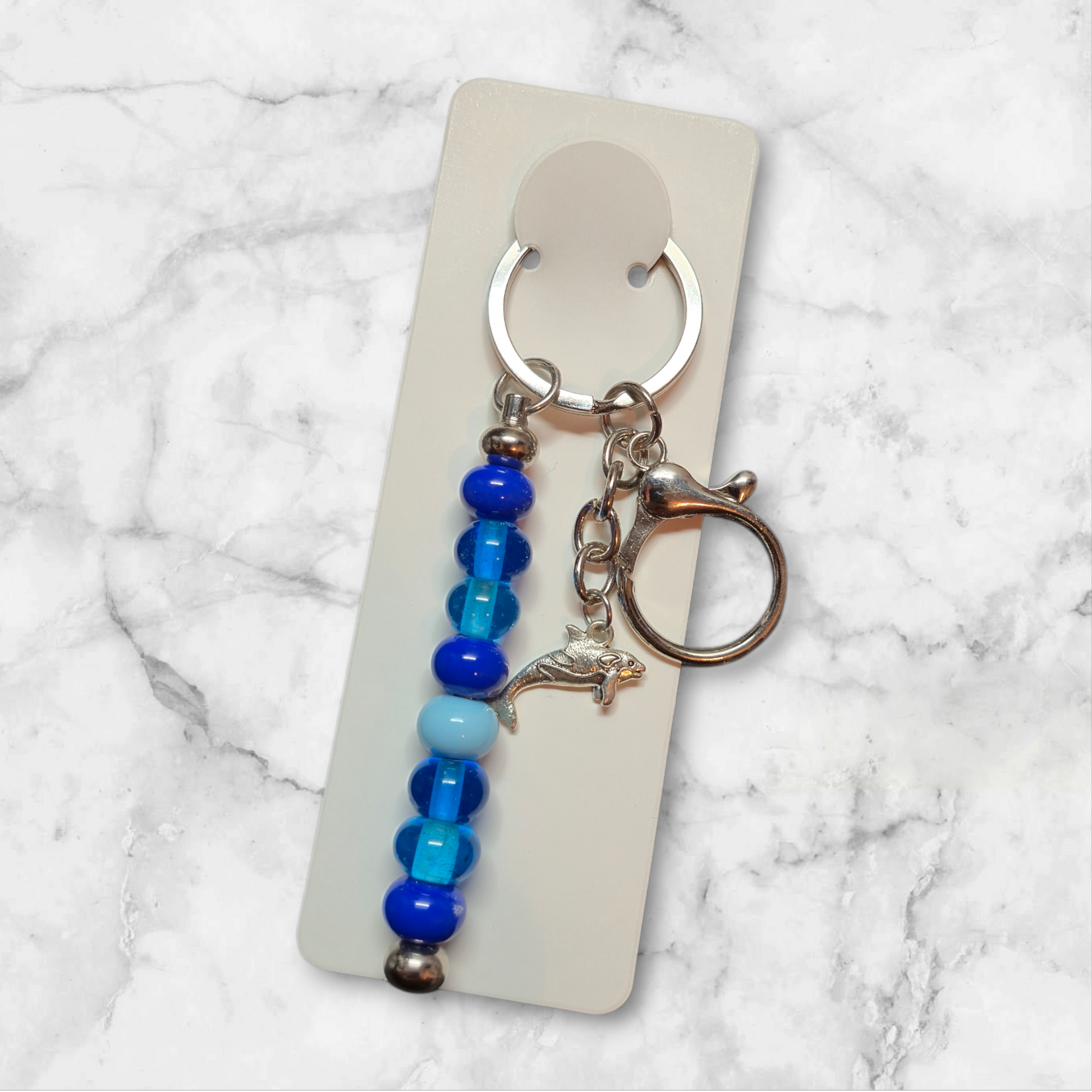 Stabschlüsselanhänger mit Wal Charm und hell und dunkel blauen Glasperlen