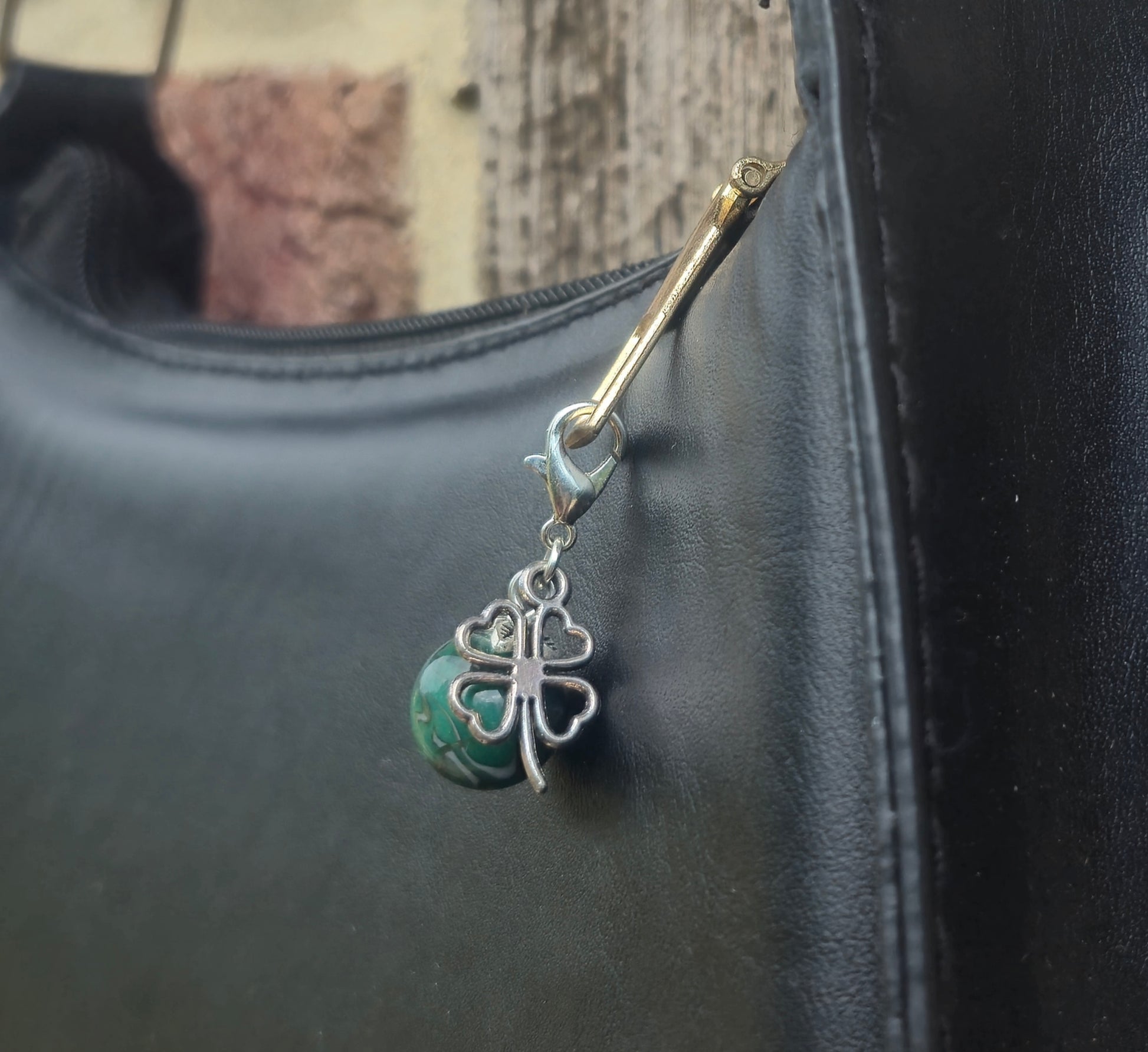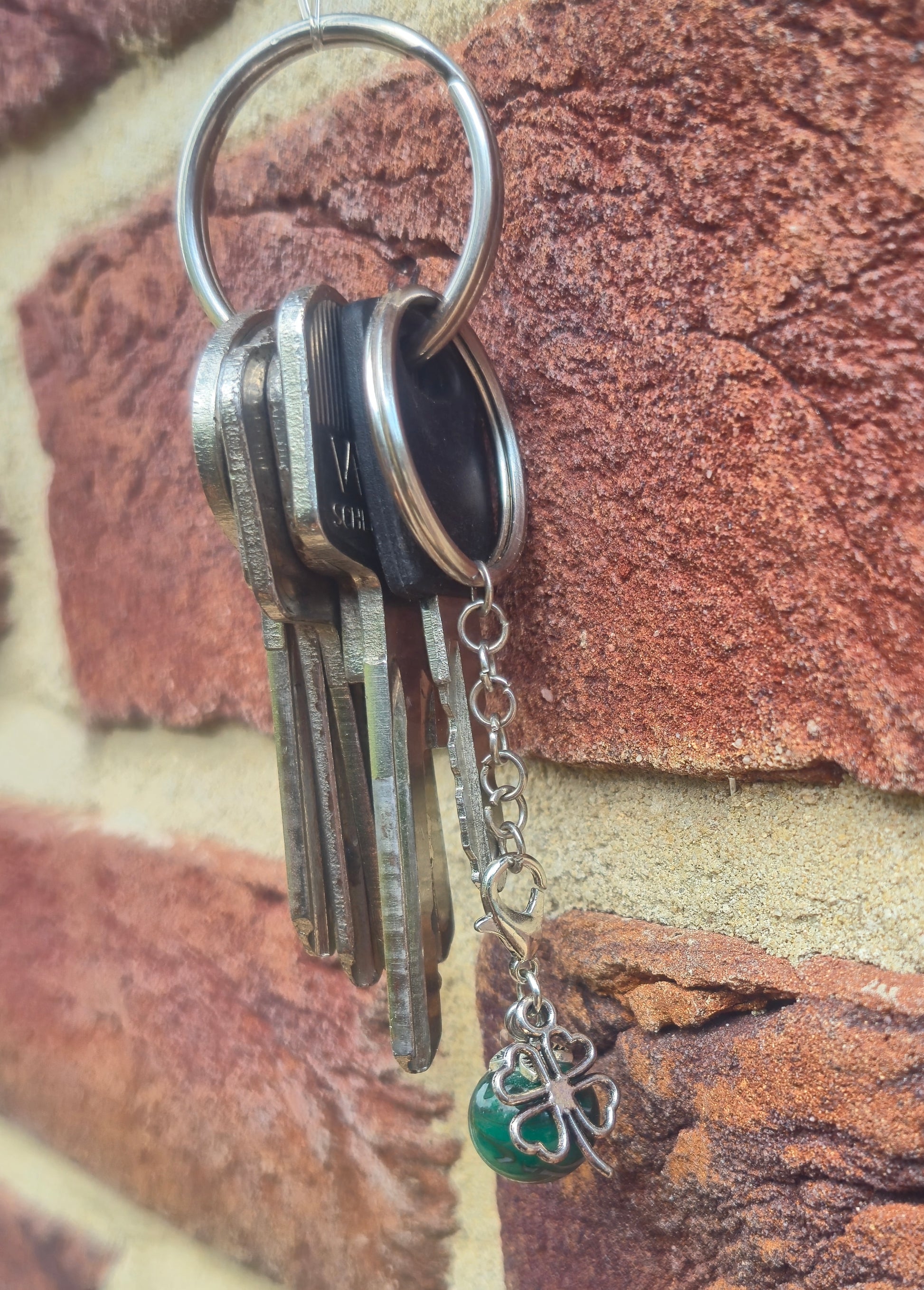 Grüner Anhänger mit Kleeblatt Charm. Die silbernen Schlüsselanhänger gibt es unter dem Punkt Zubehör.