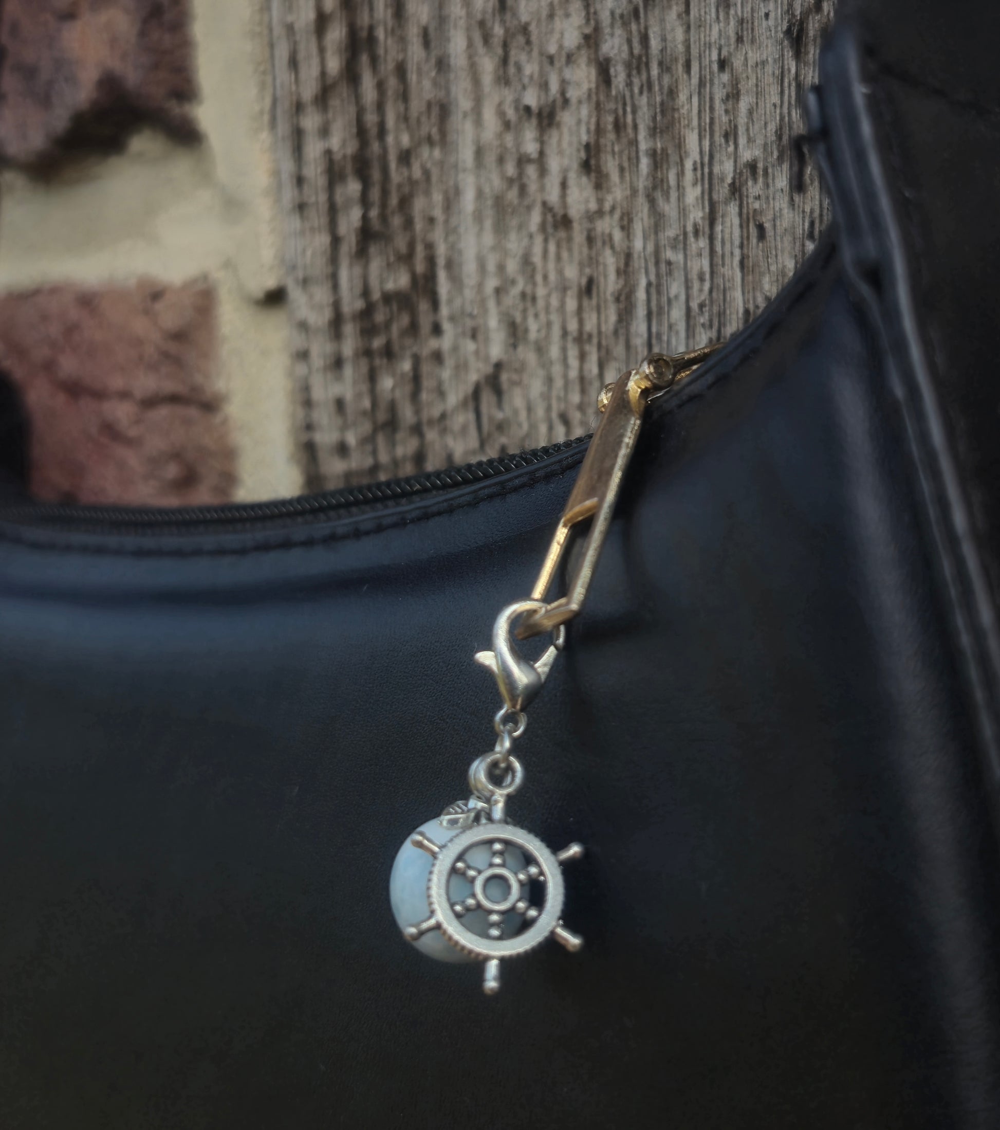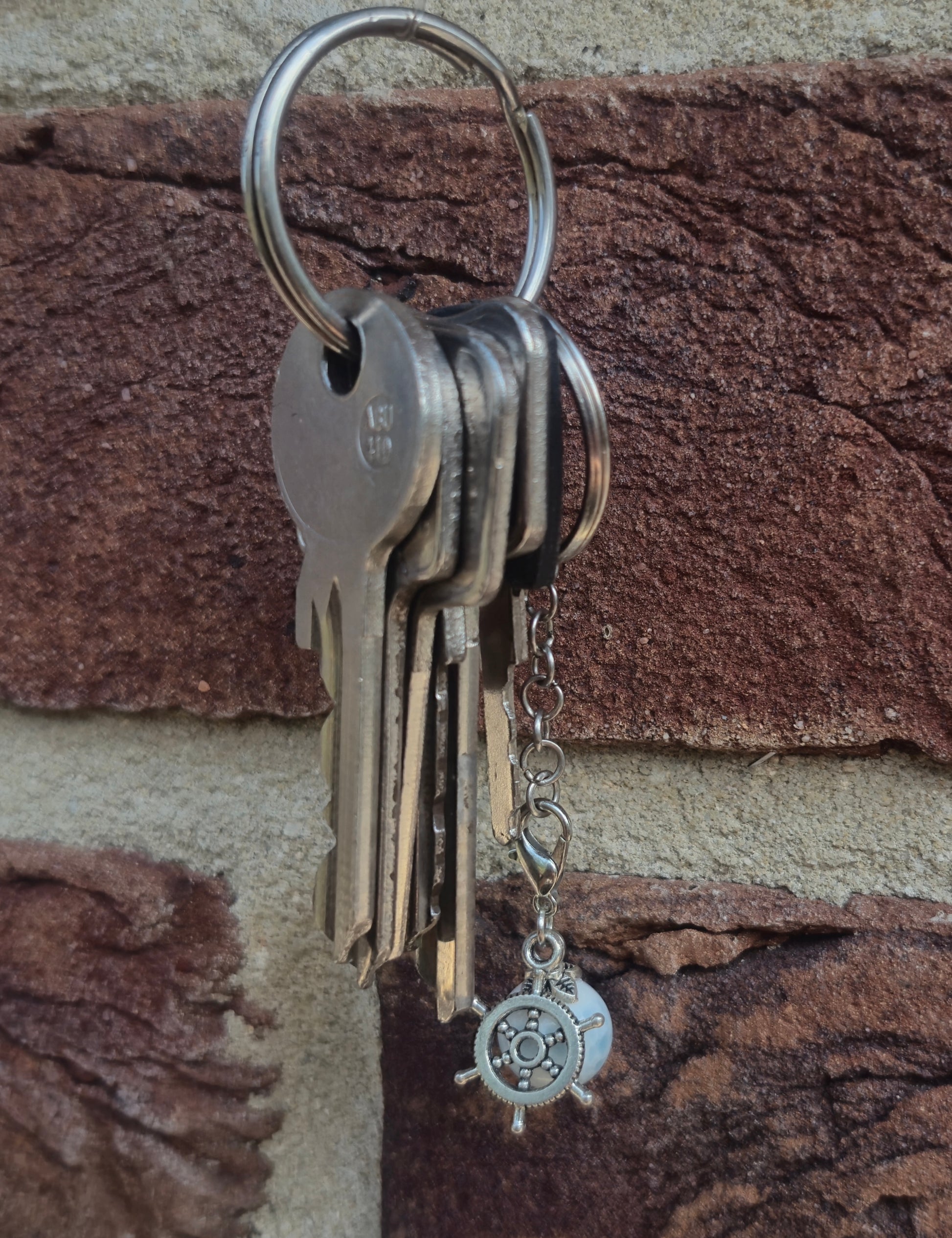 Weißer Anhänger mit blauen Flecken und Steuerrad Charm. Die silbernen Schlüsselanhänger gibt es unter dem Punkt Zubehör.