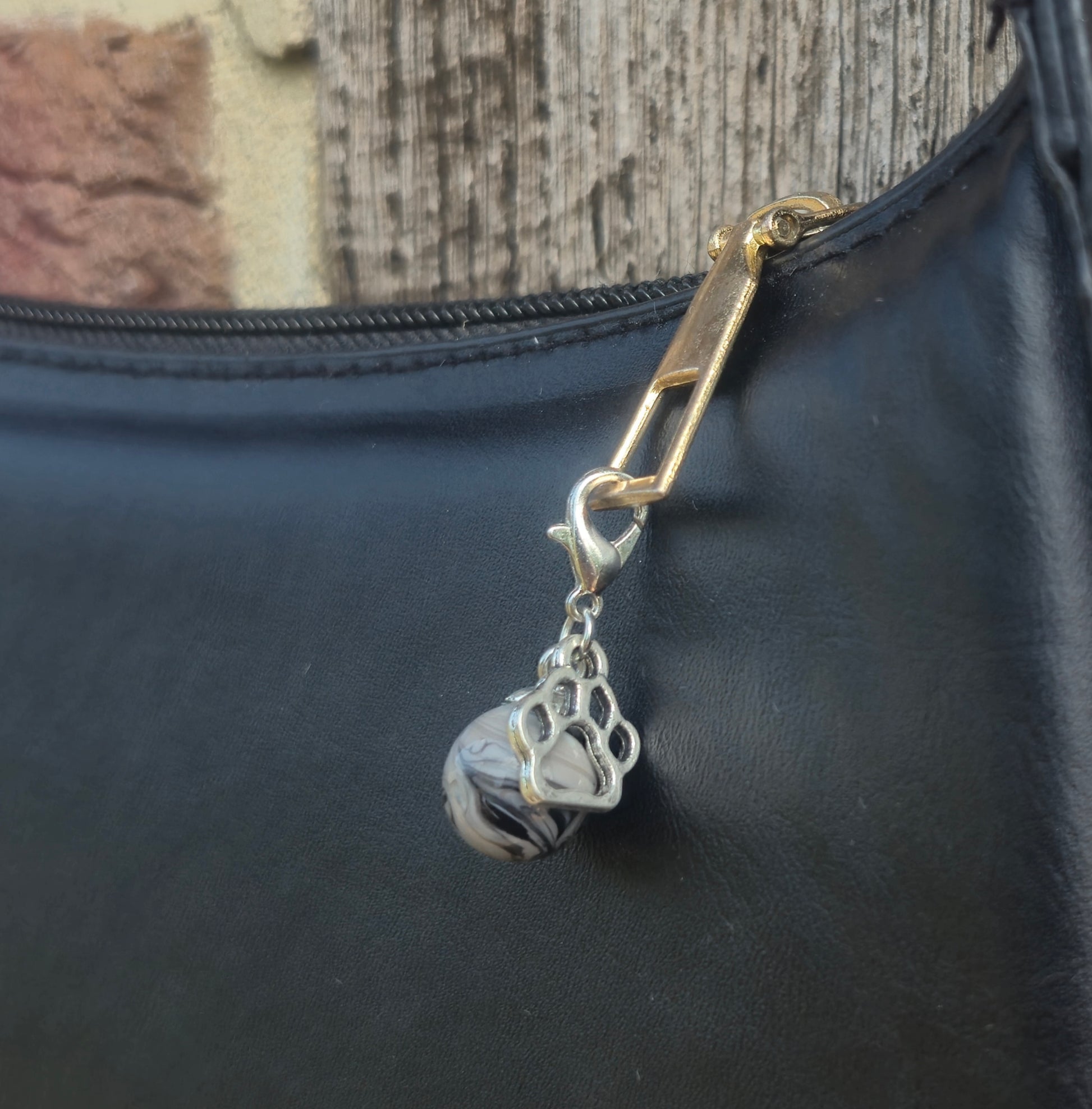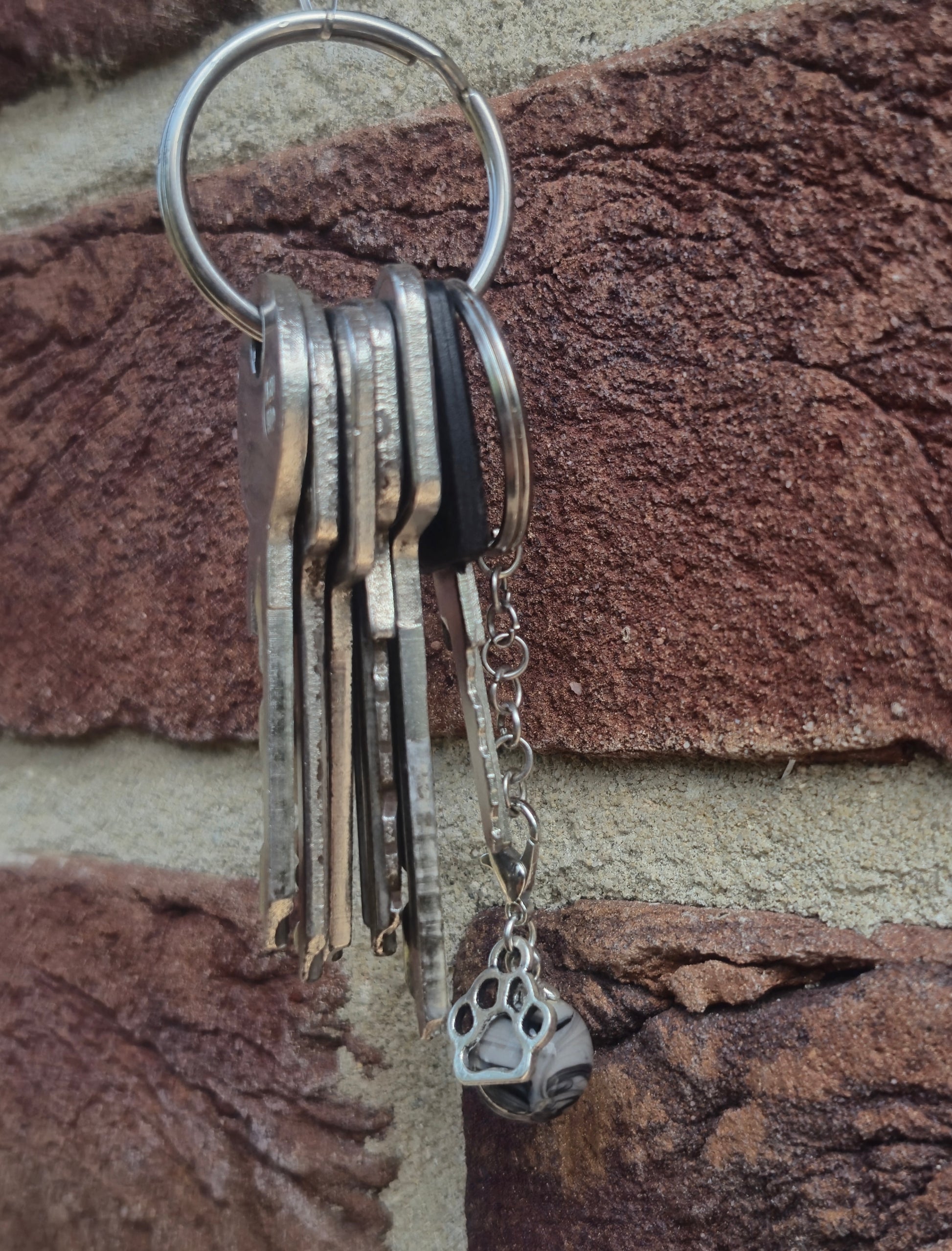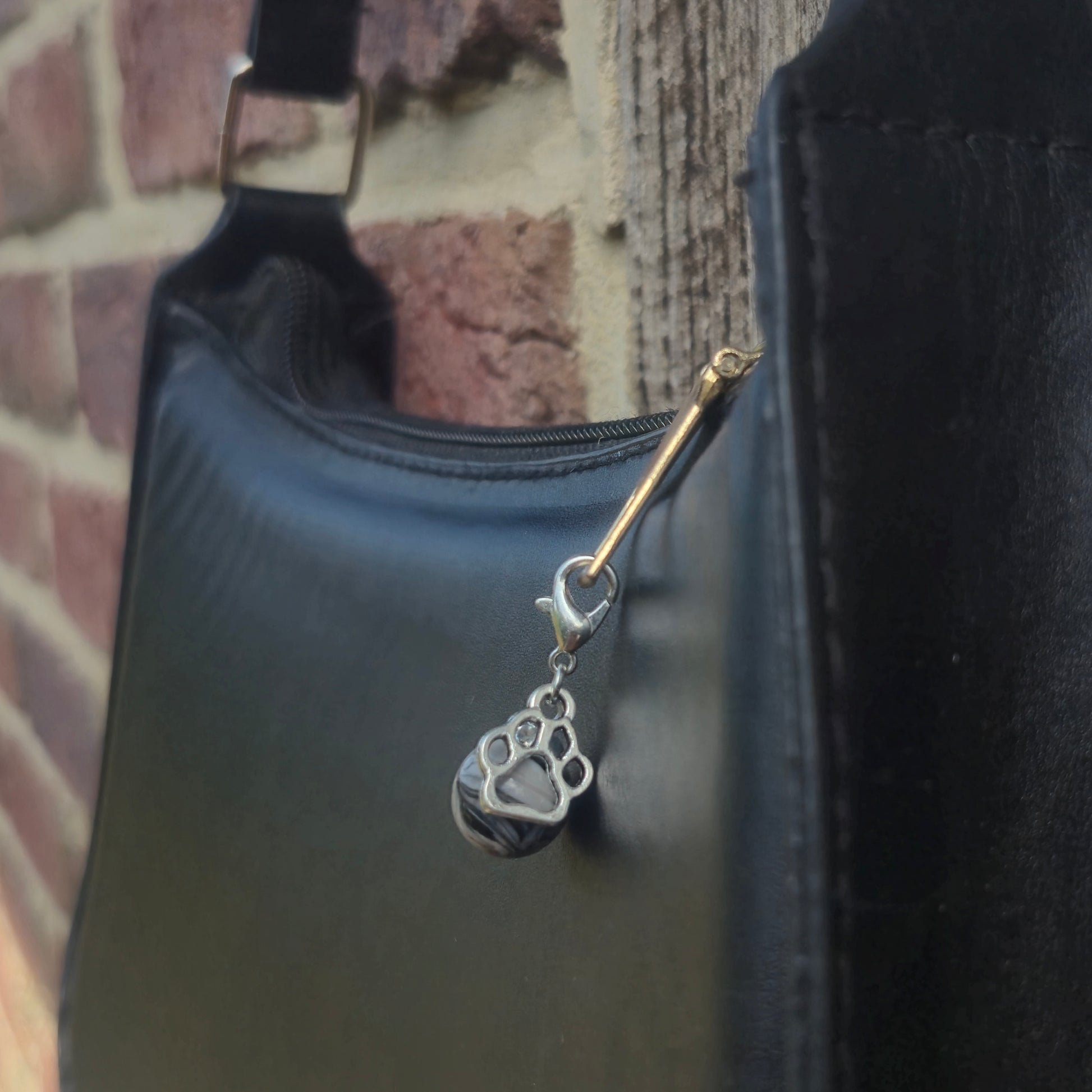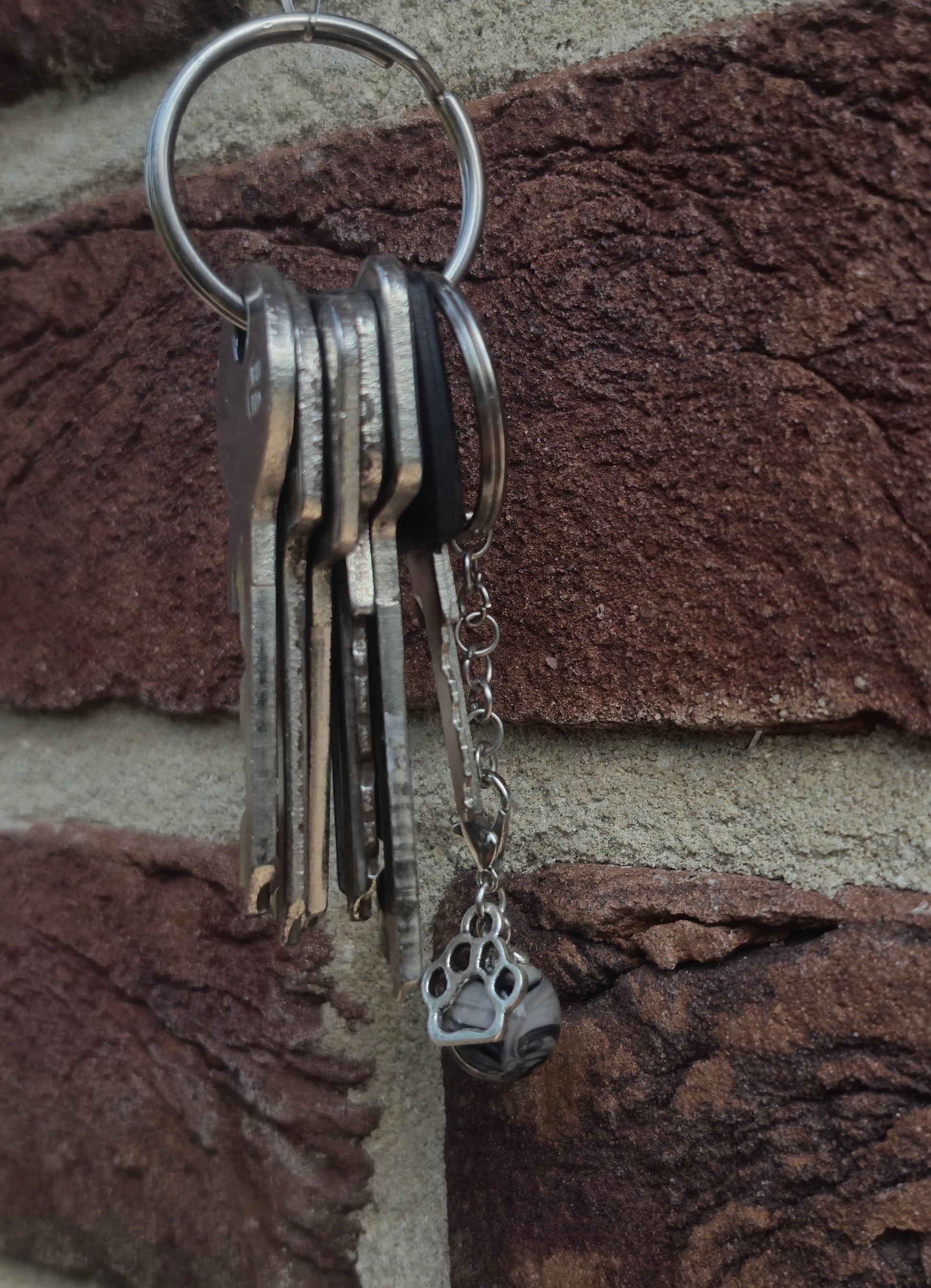 Grau schwarzer Anhänger mit Pfoten Charm. Die silbernen Schlüsselanhänger gibt es unter dem Punkt Zubehör.