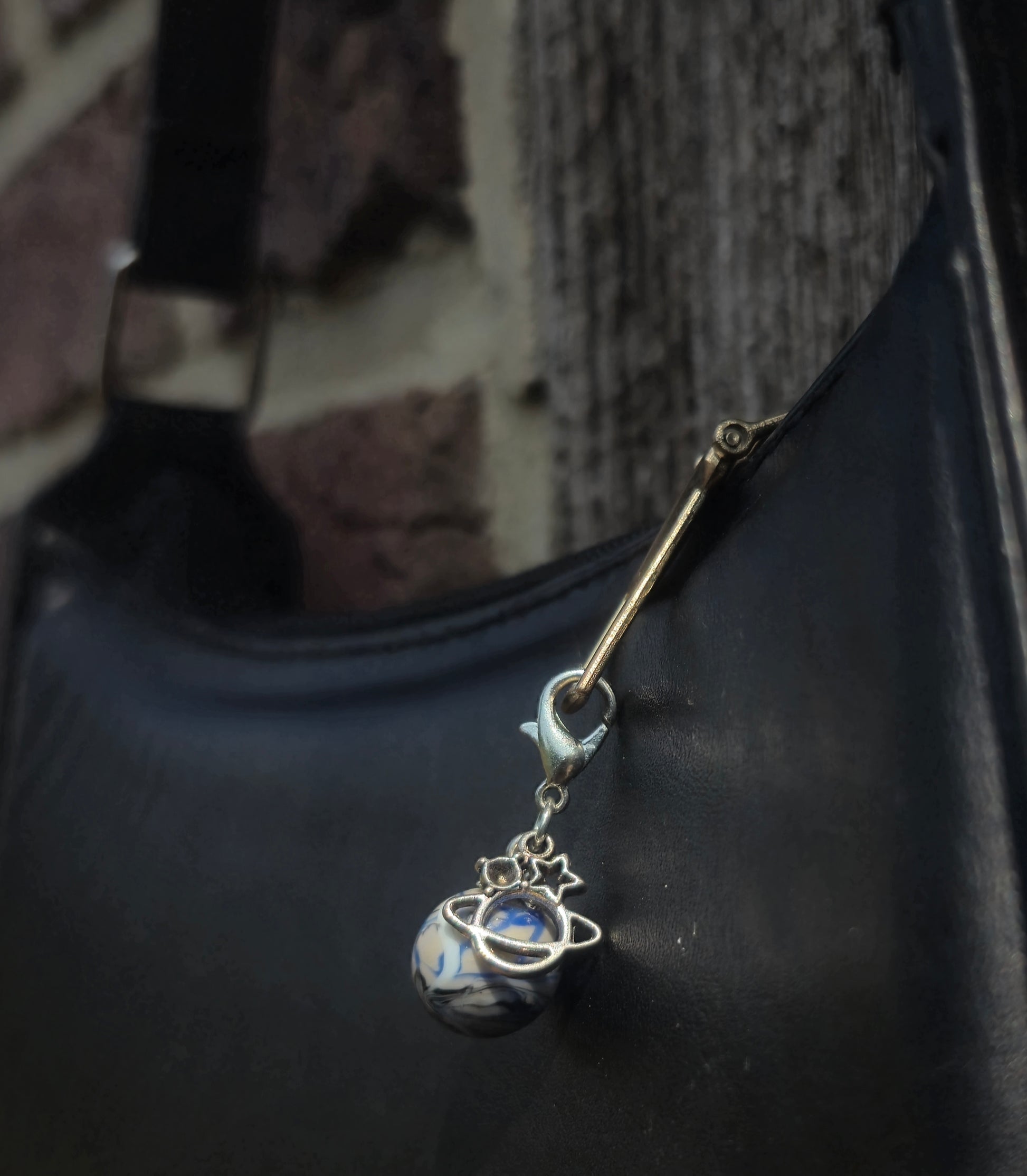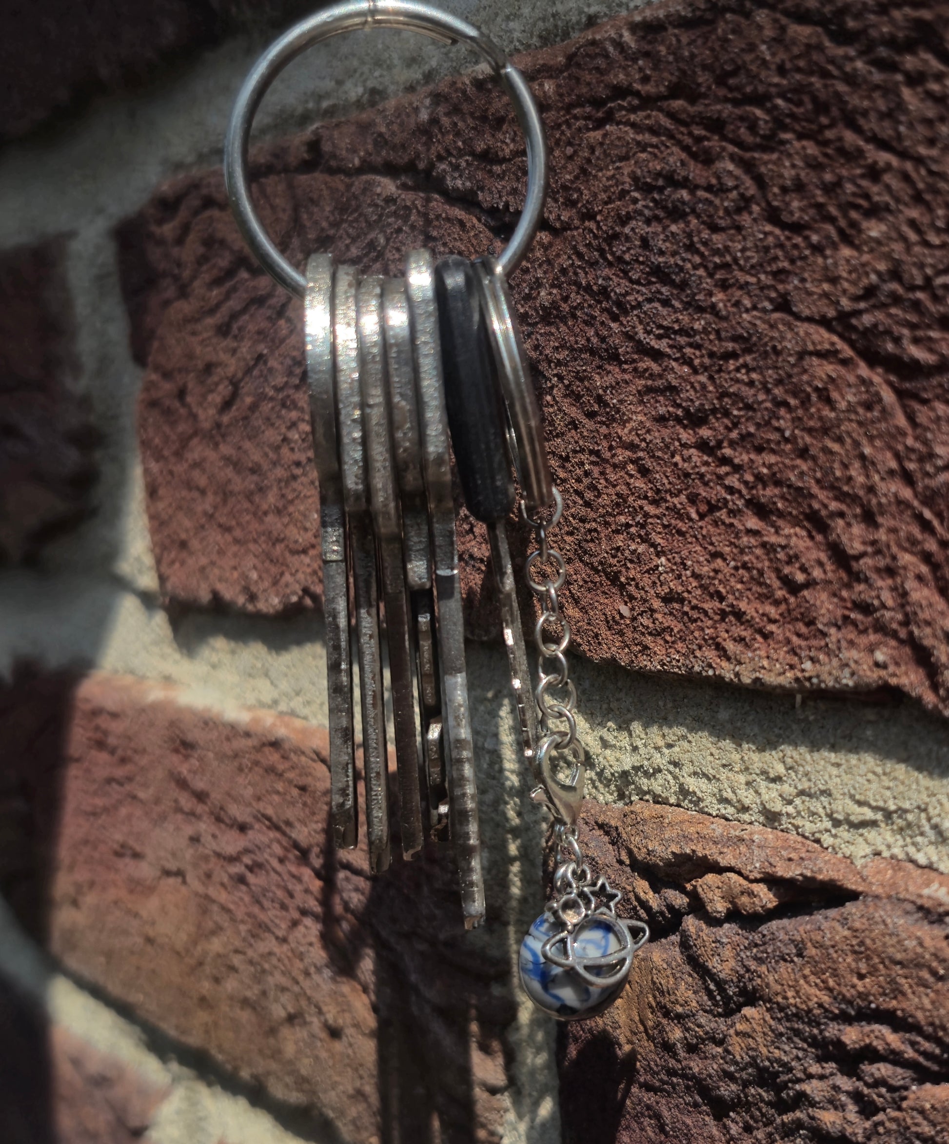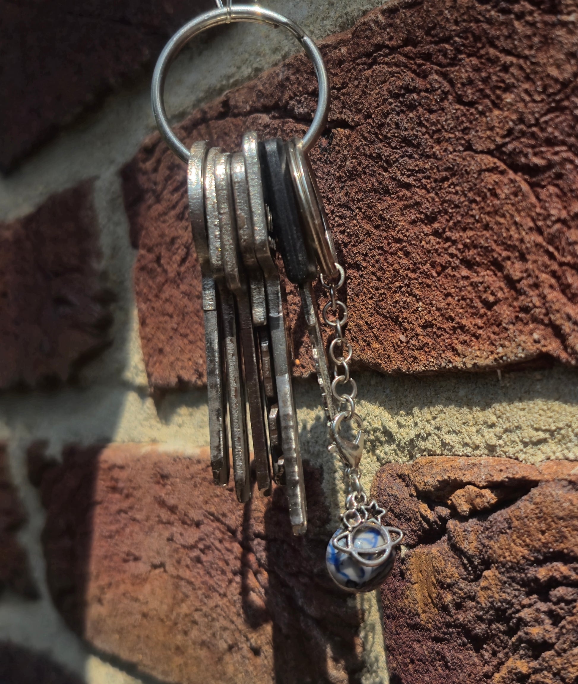 Grau blauer Anhänger mit Planeten Charm.Die silbernen Schlüsselanhänger gibt es unter dem Punkt Zubehör.