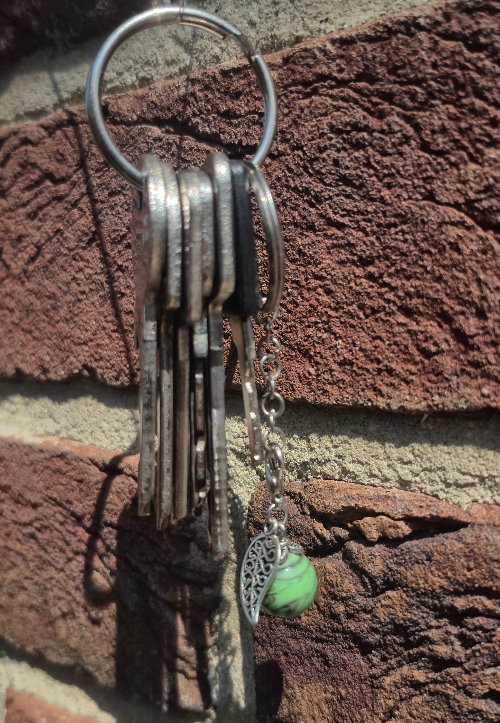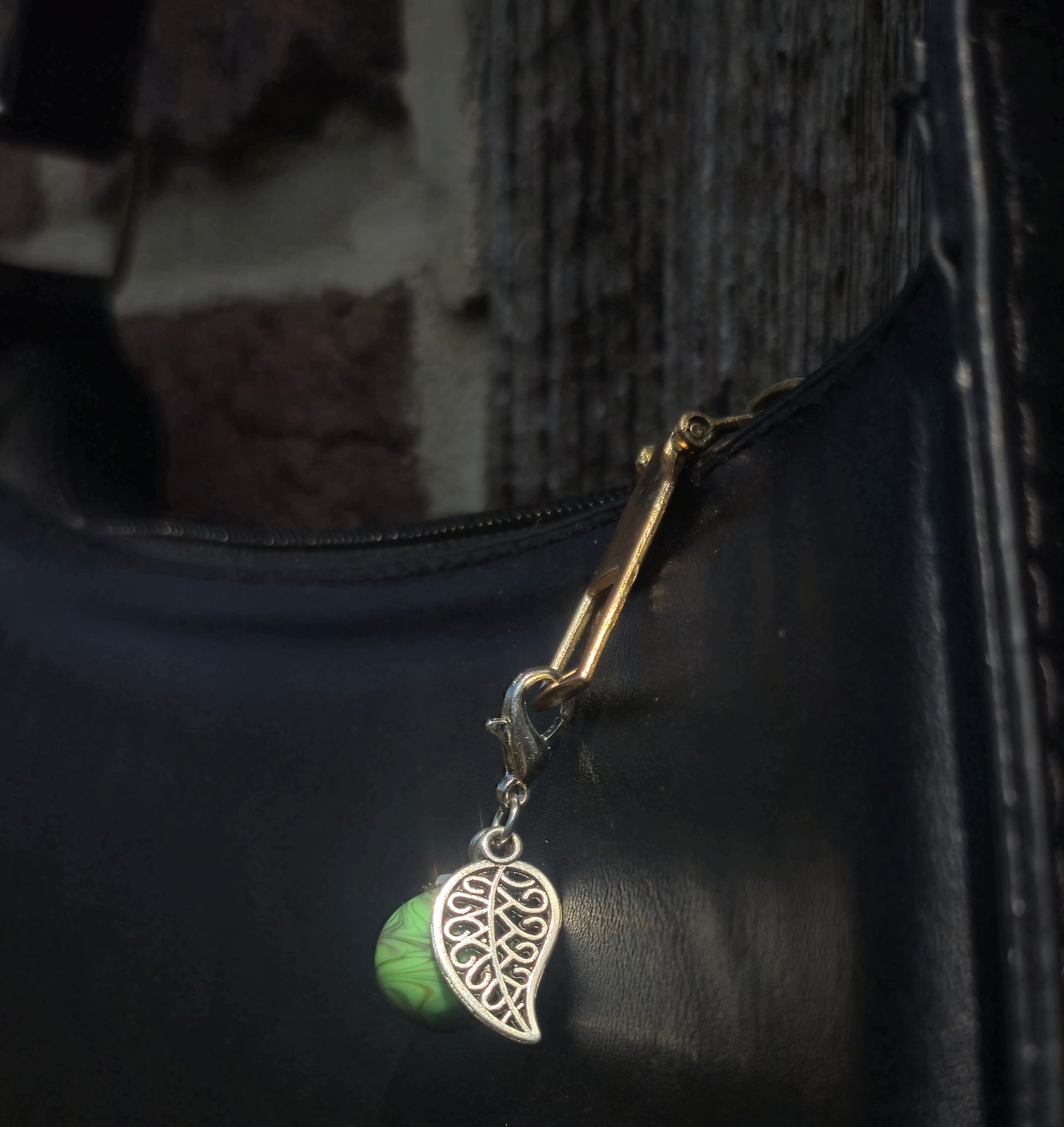 Grüner Anhänger mit Blatt Charm.Die silbernen Schlüsselanhänger gibt es unter dem Punkt Zubehör.