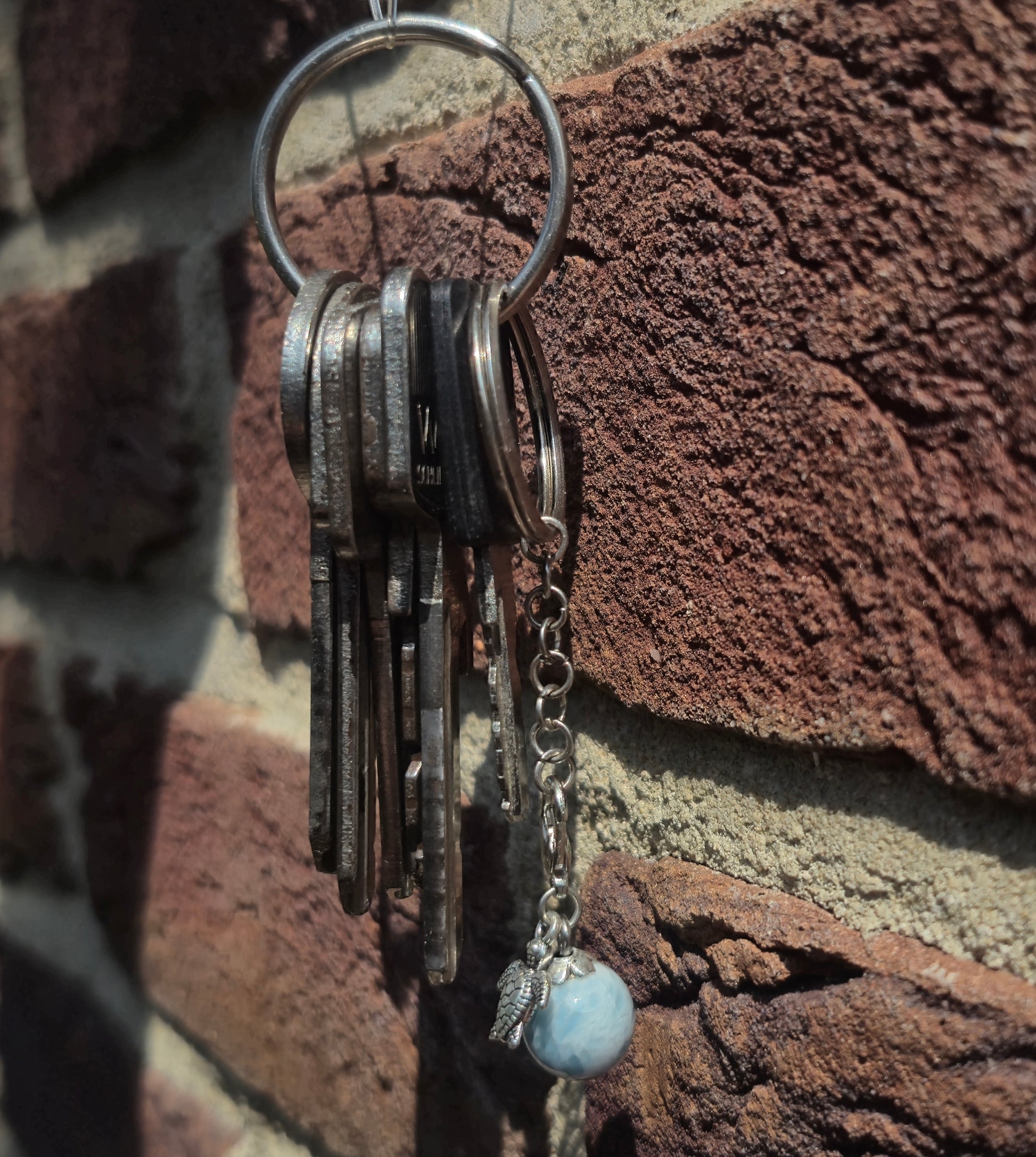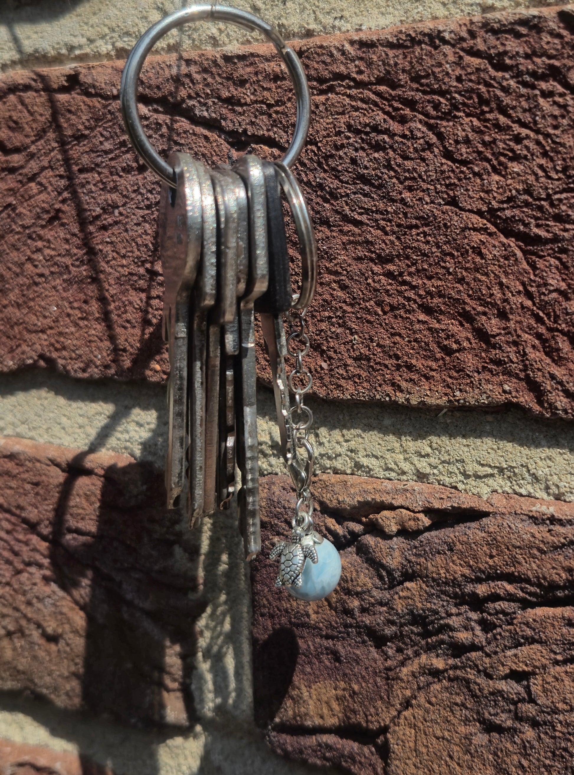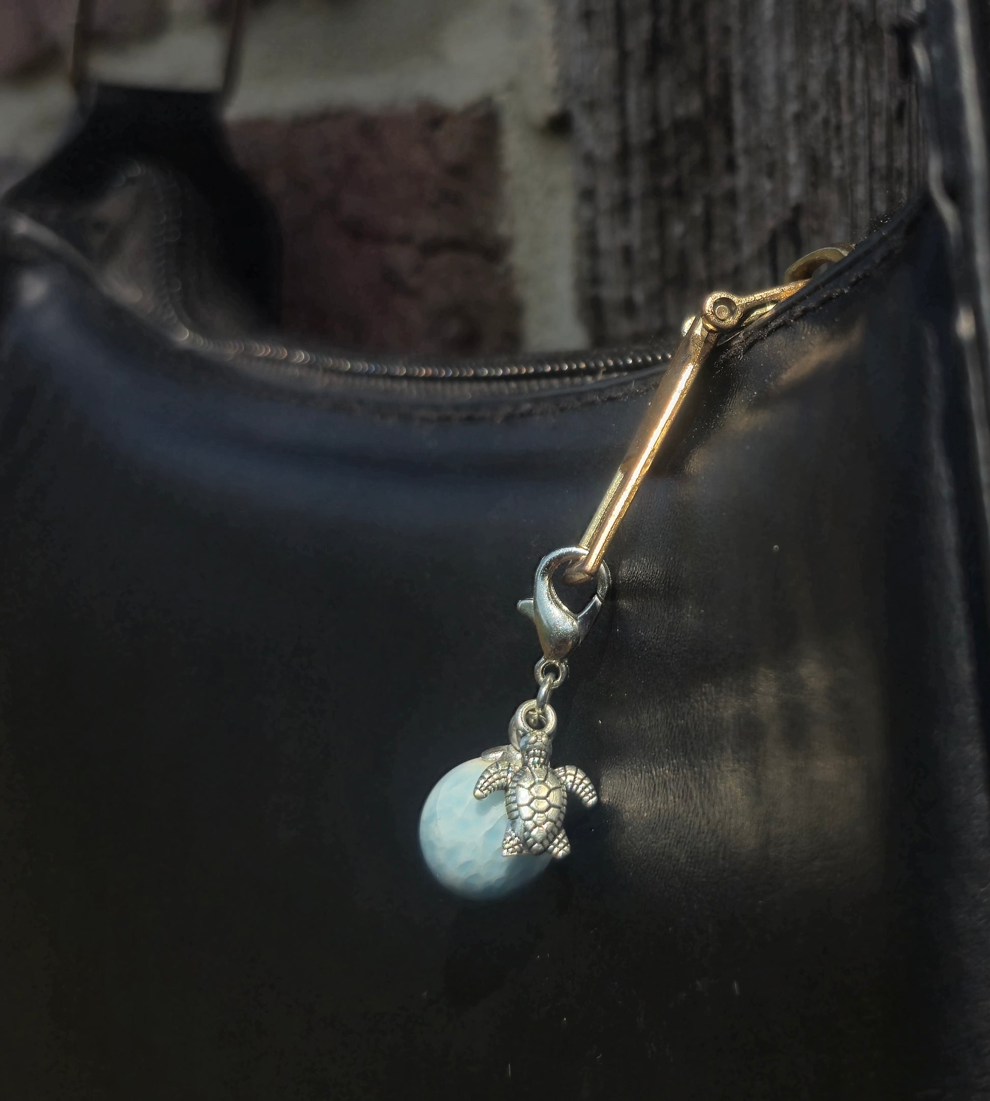 Weißer Anhänger mit blauen Flecken und Schildkröten Charm.Die silbernen Schlüsselanhänger gibt es unter dem Punkt Zubehör.