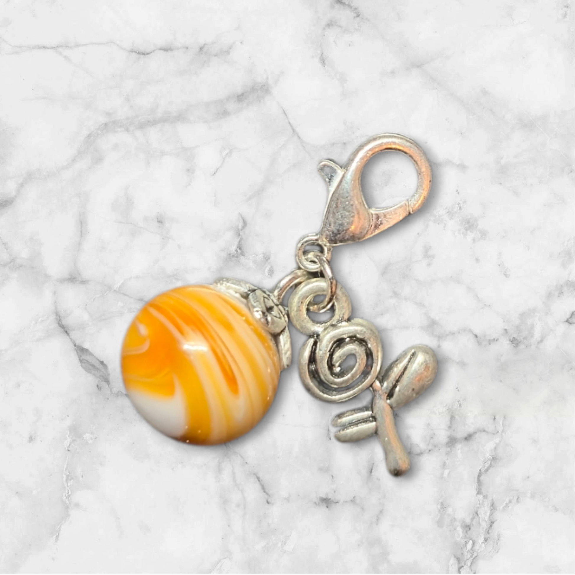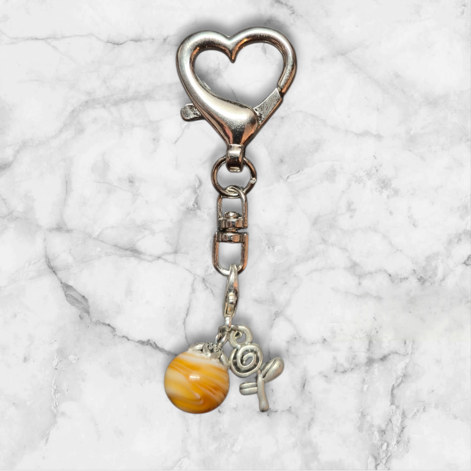 Taschen- und Schlüsselanhänger(ohne Herz anhänger). Die Glasperle ist in der mitte Weiß und mit rot braunen transparenten Glas umwickelt und mit einem Rosen Charm.