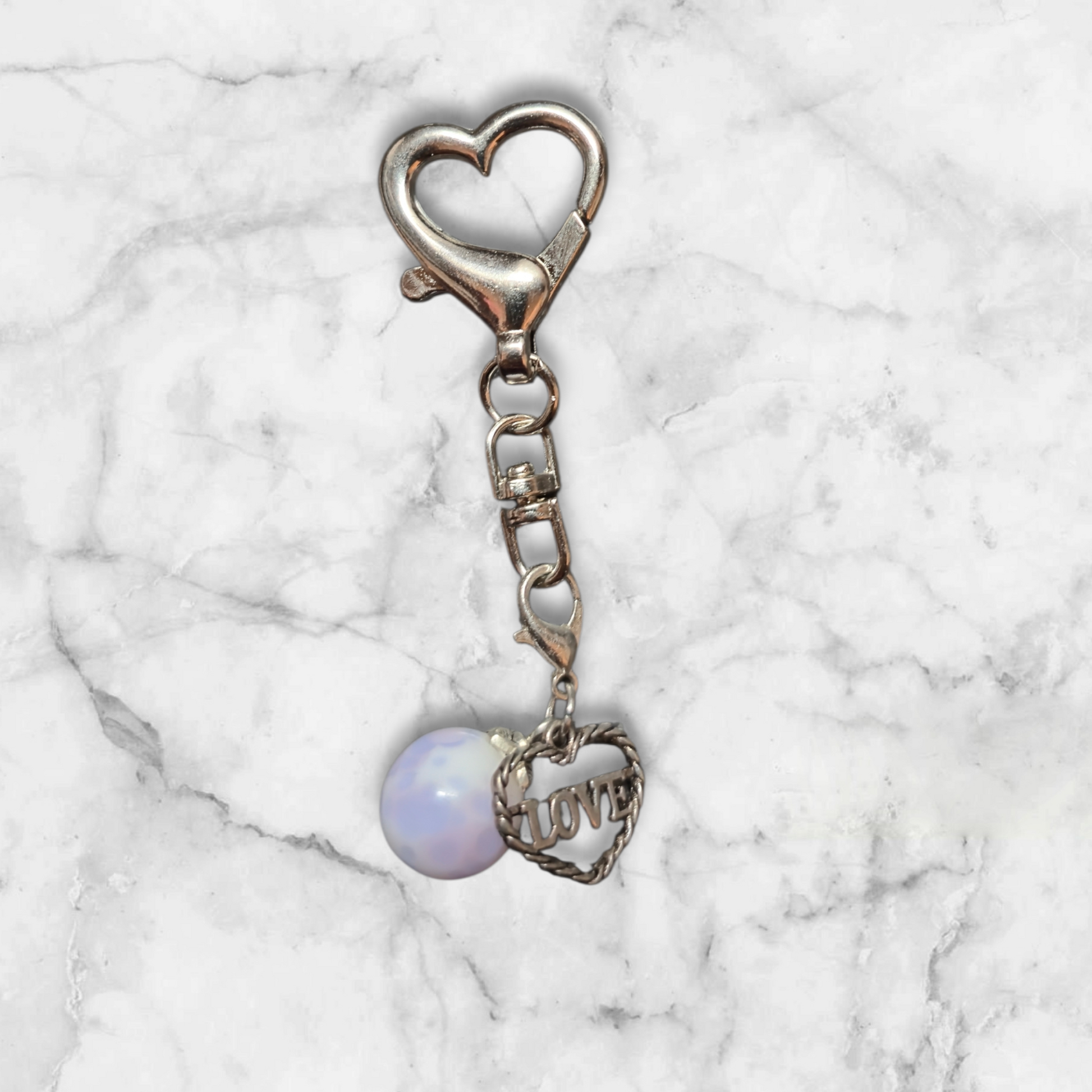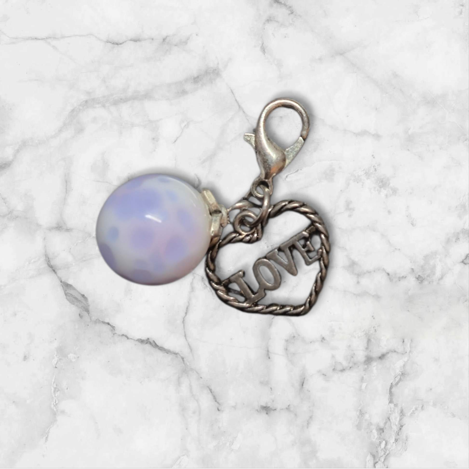 Taschen- und Schlüsselanhänger(ohne Herz anhänger). Die Glasperle ist weiß mit lila flecken und mit einem Herz Charm.