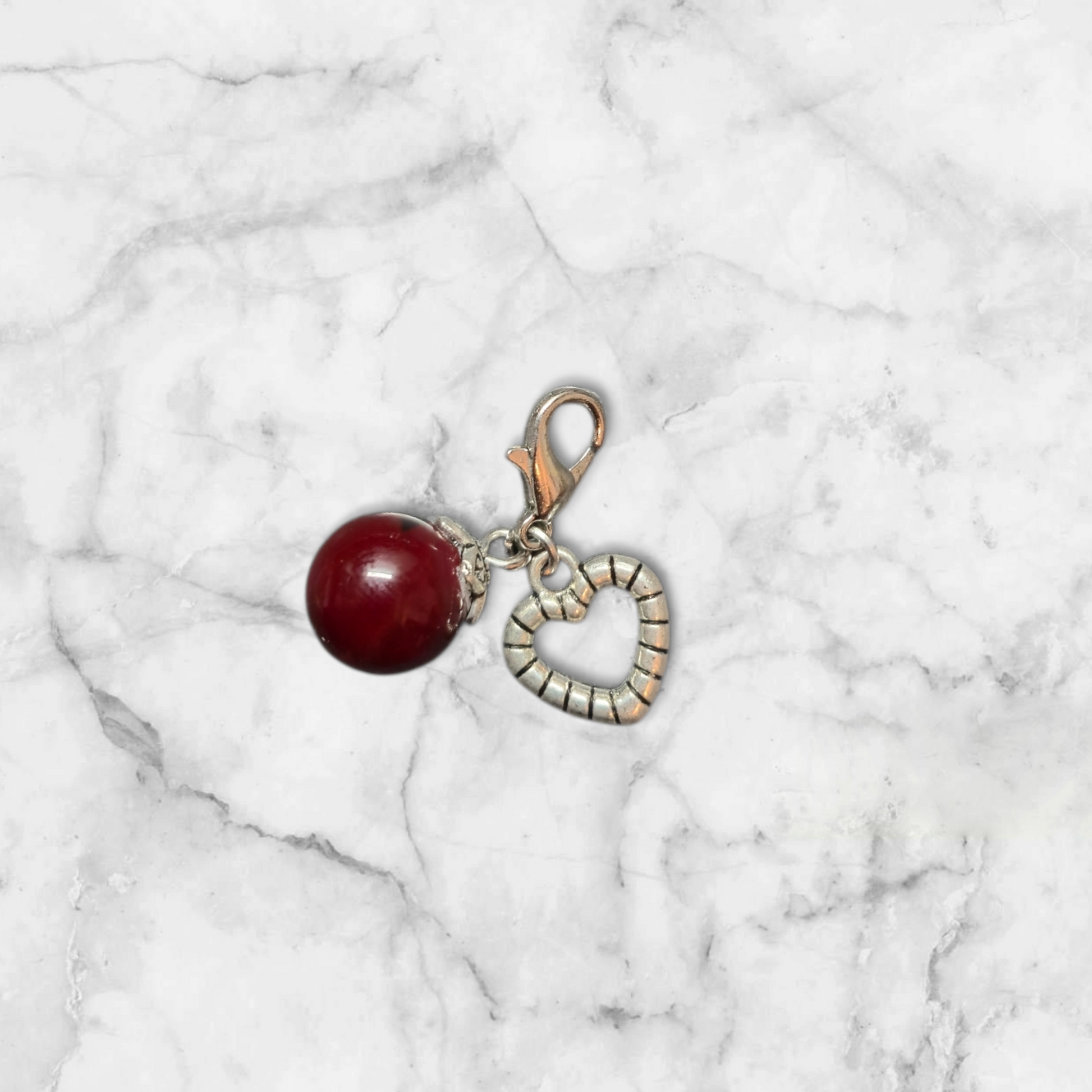 Taschen- und Schlüsselanhänger(ohne Herz anhänger). Die Glasperle ist dunkelrot mit einem Herz Charm.