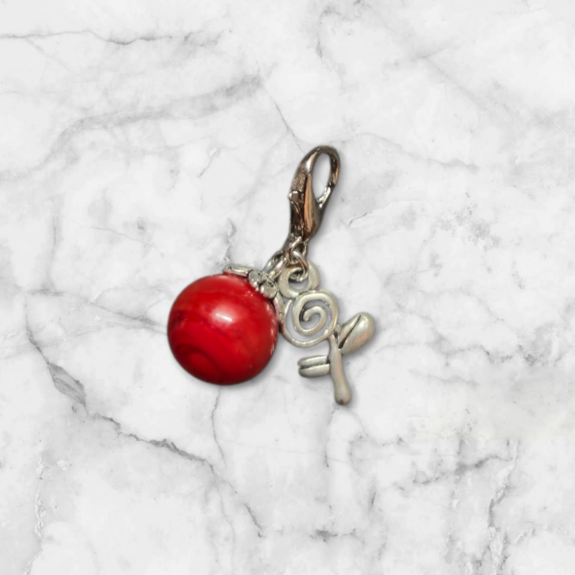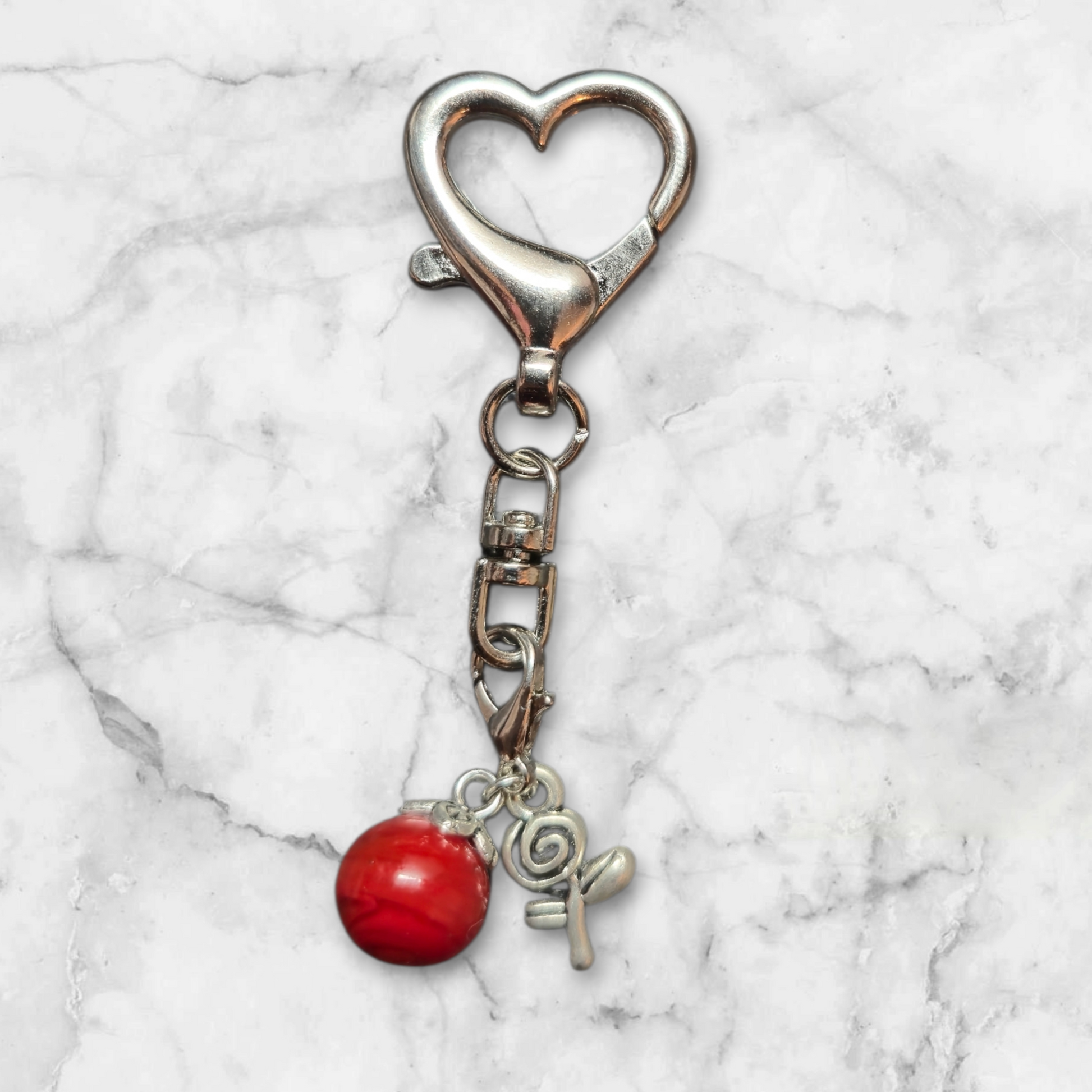 Taschen- und Schlüsselanhänger(ohne Herz anhänger). Die Glasperle ist hellrot und dunkelrot mit einem Rosen Charm.