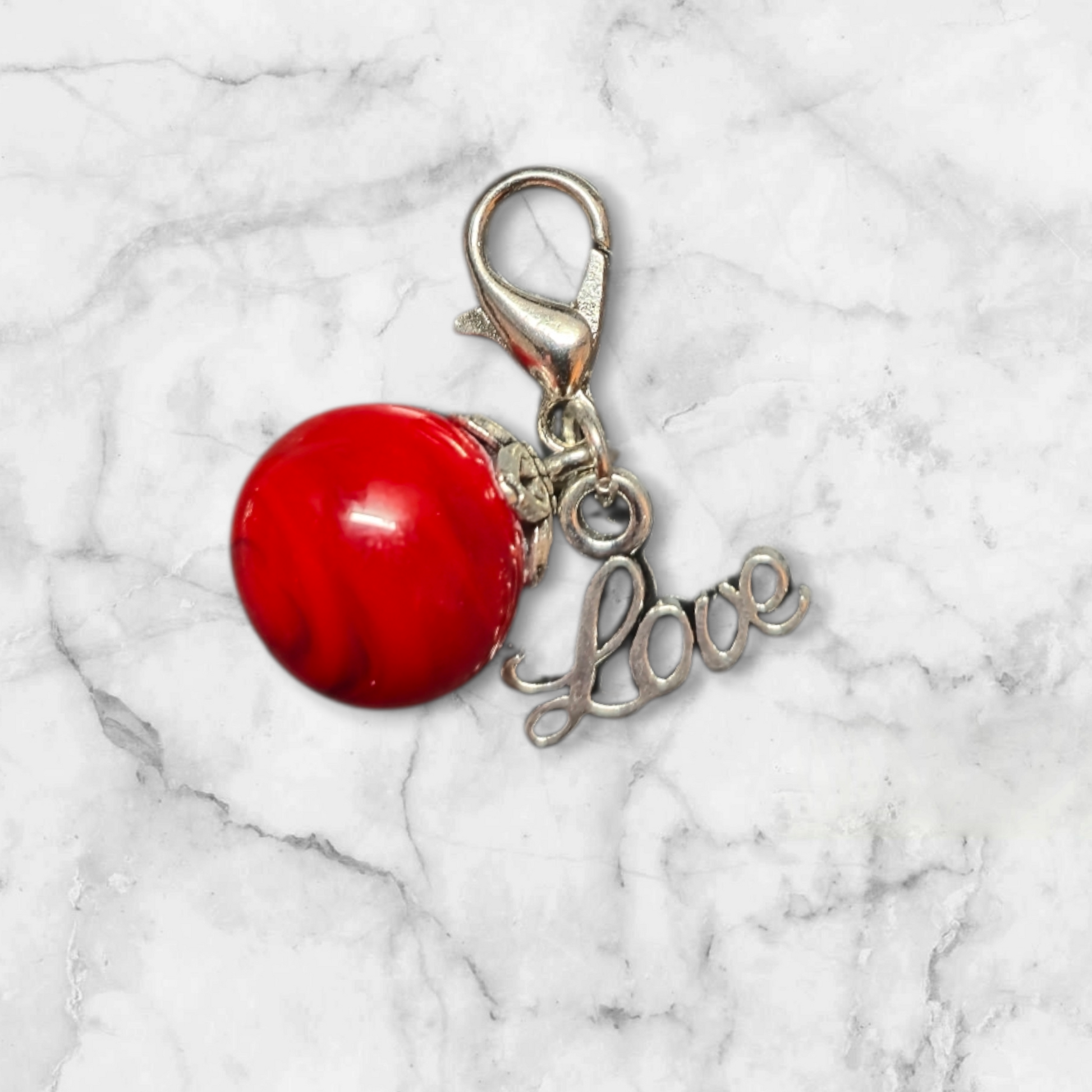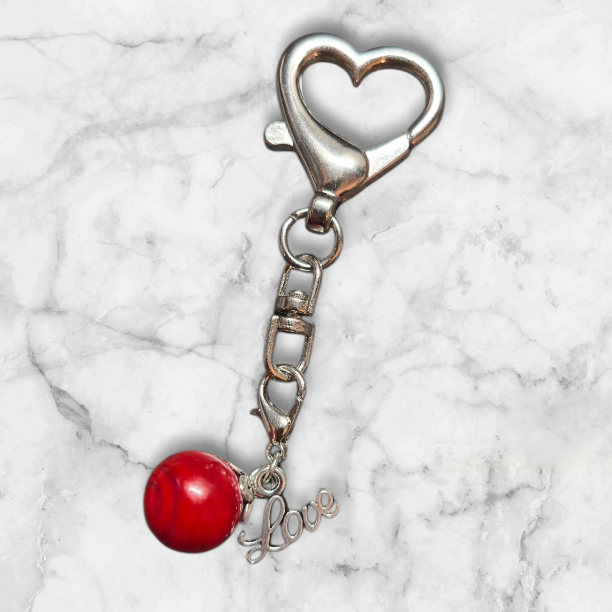 Taschen- und Schlüsselanhänger(ohne Herz anhänger). Die Glasperle ist hellrot und dunkelrot mit einem love Charm.