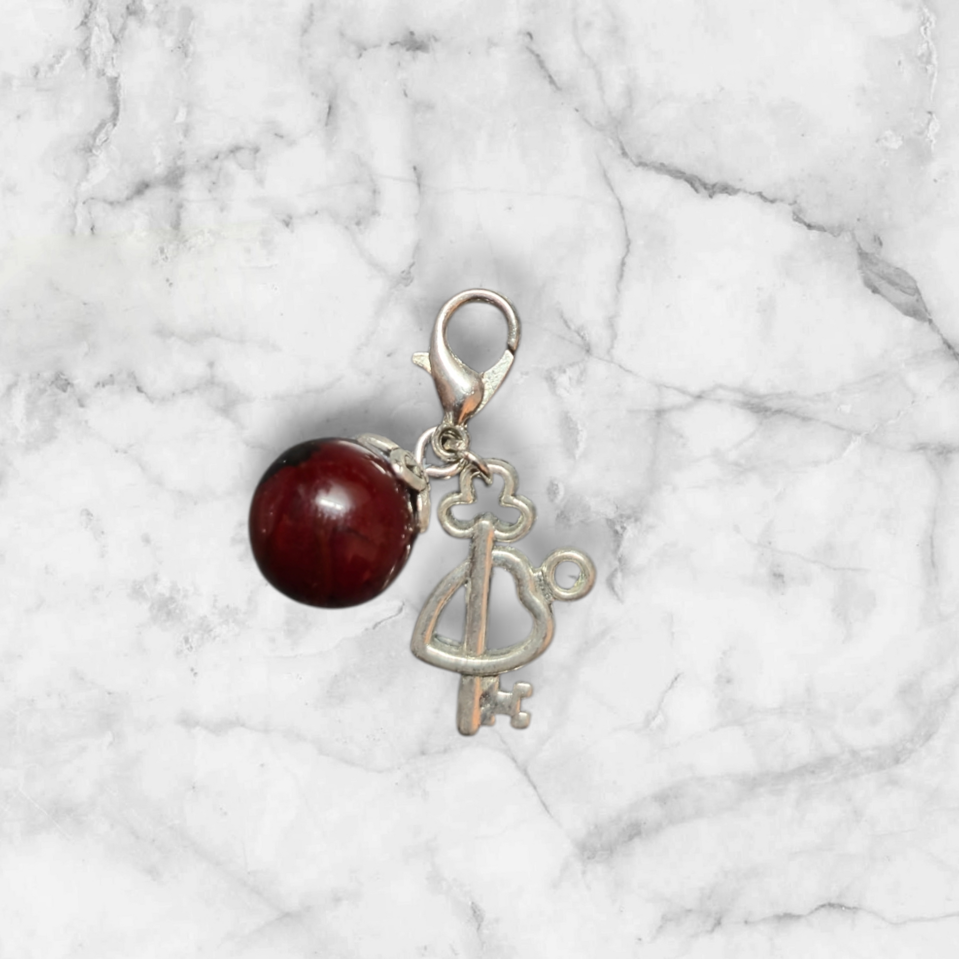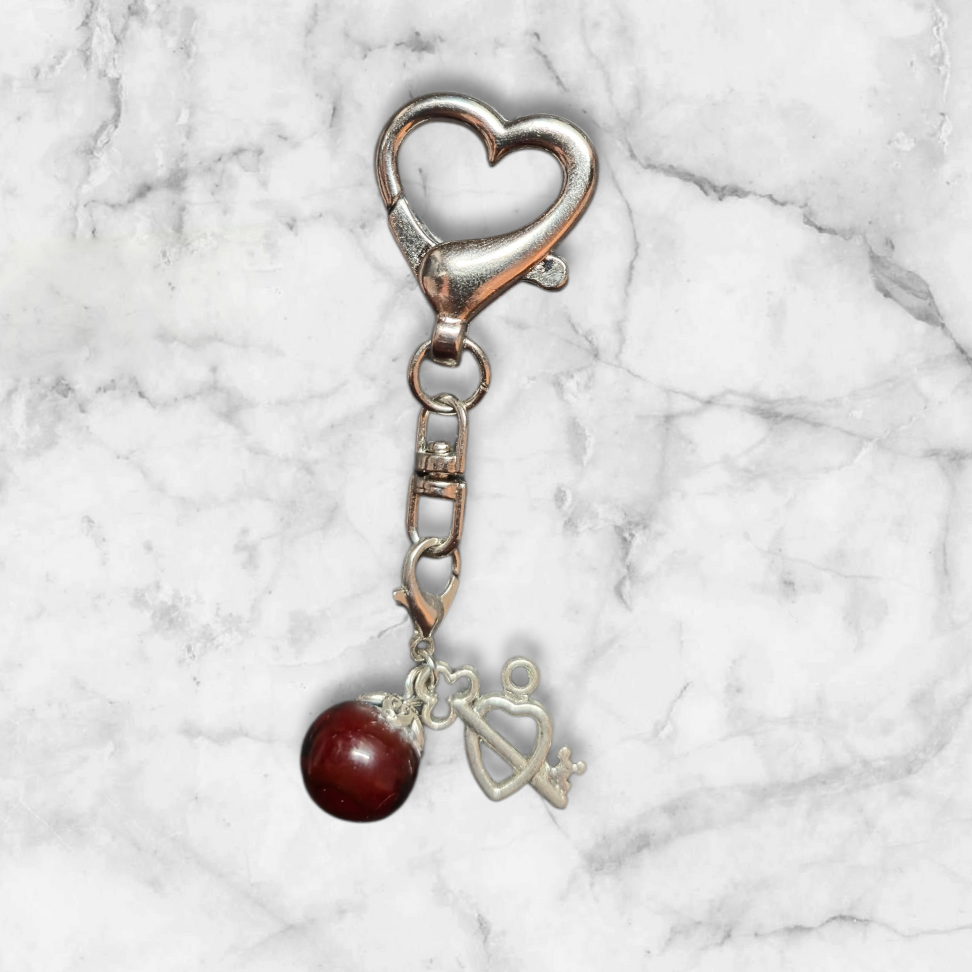 Taschen- und Schlüsselanhänger(ohne Herz anhänger). Die Glasperle ist dunkelrot mit einem Herz und Schlüssel Charm.