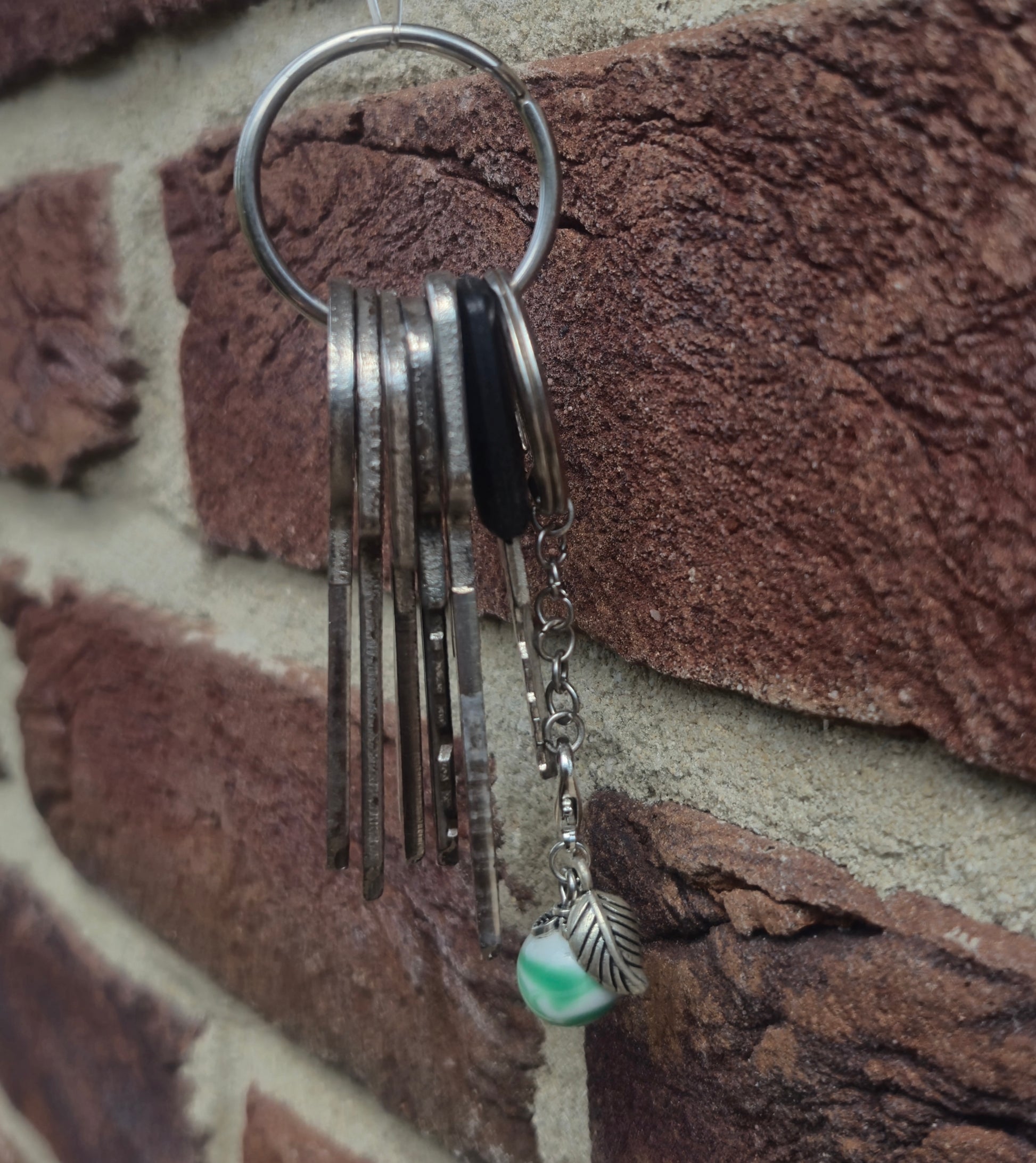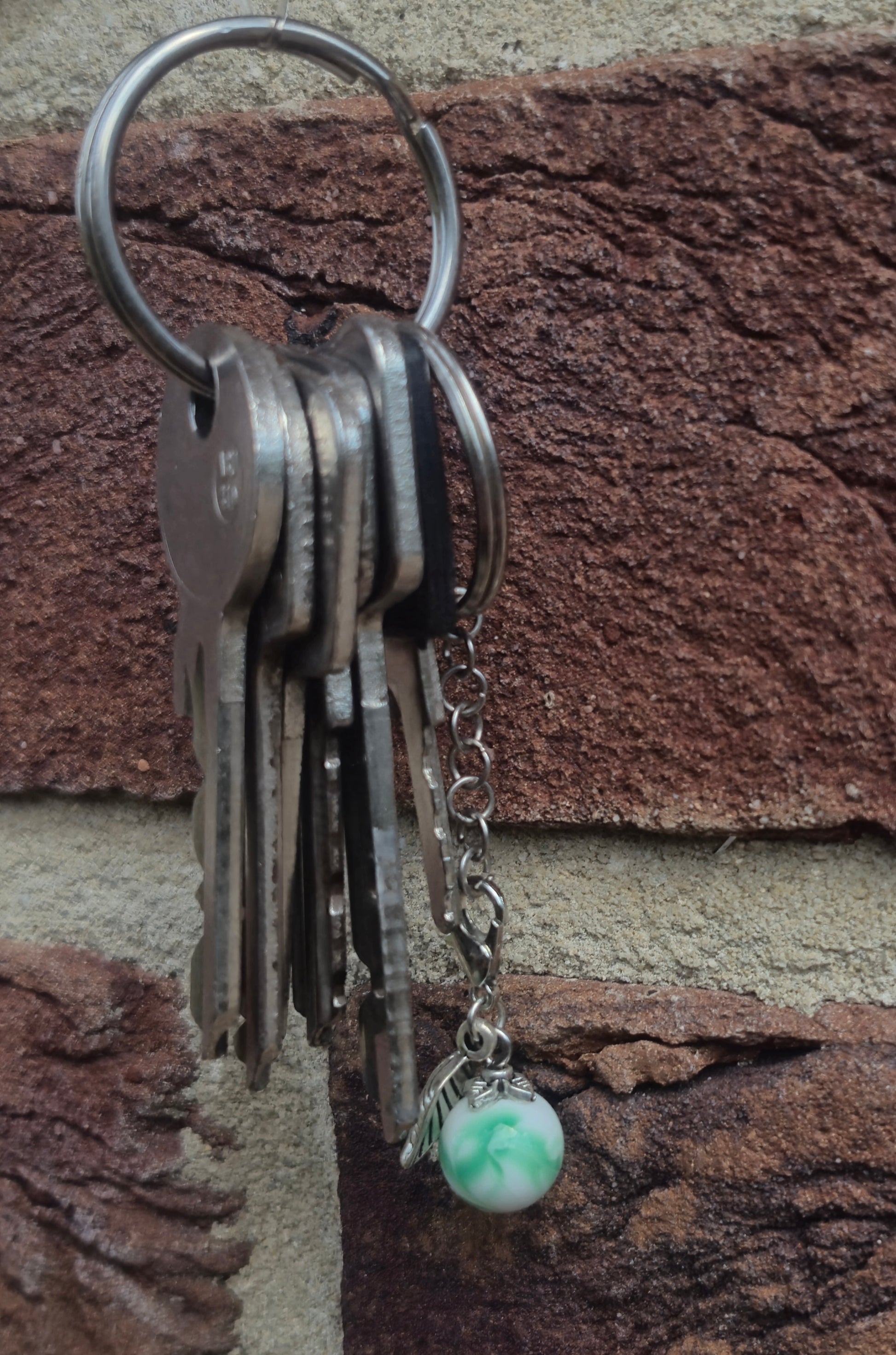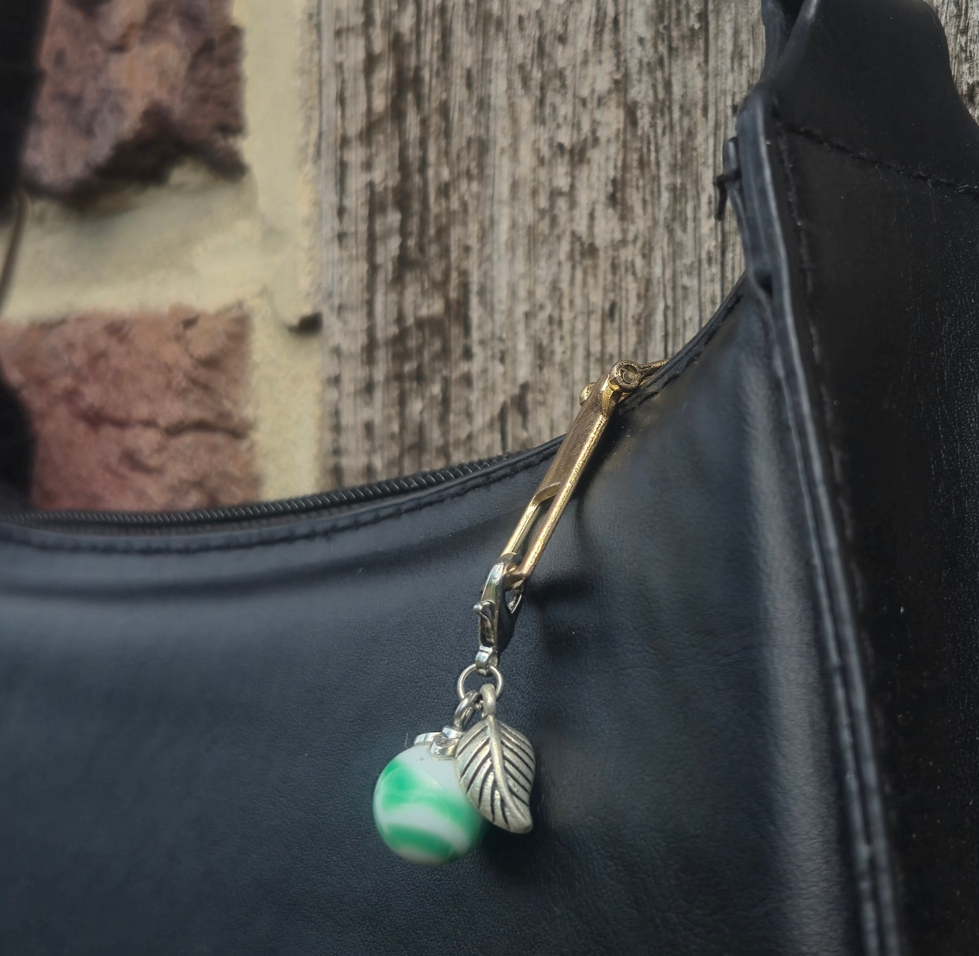 Weiß grüner Anhänger mit Blatt Charm. Die silbernen Schlüsselanhänger gibt es unter dem Punkt Zubehör.