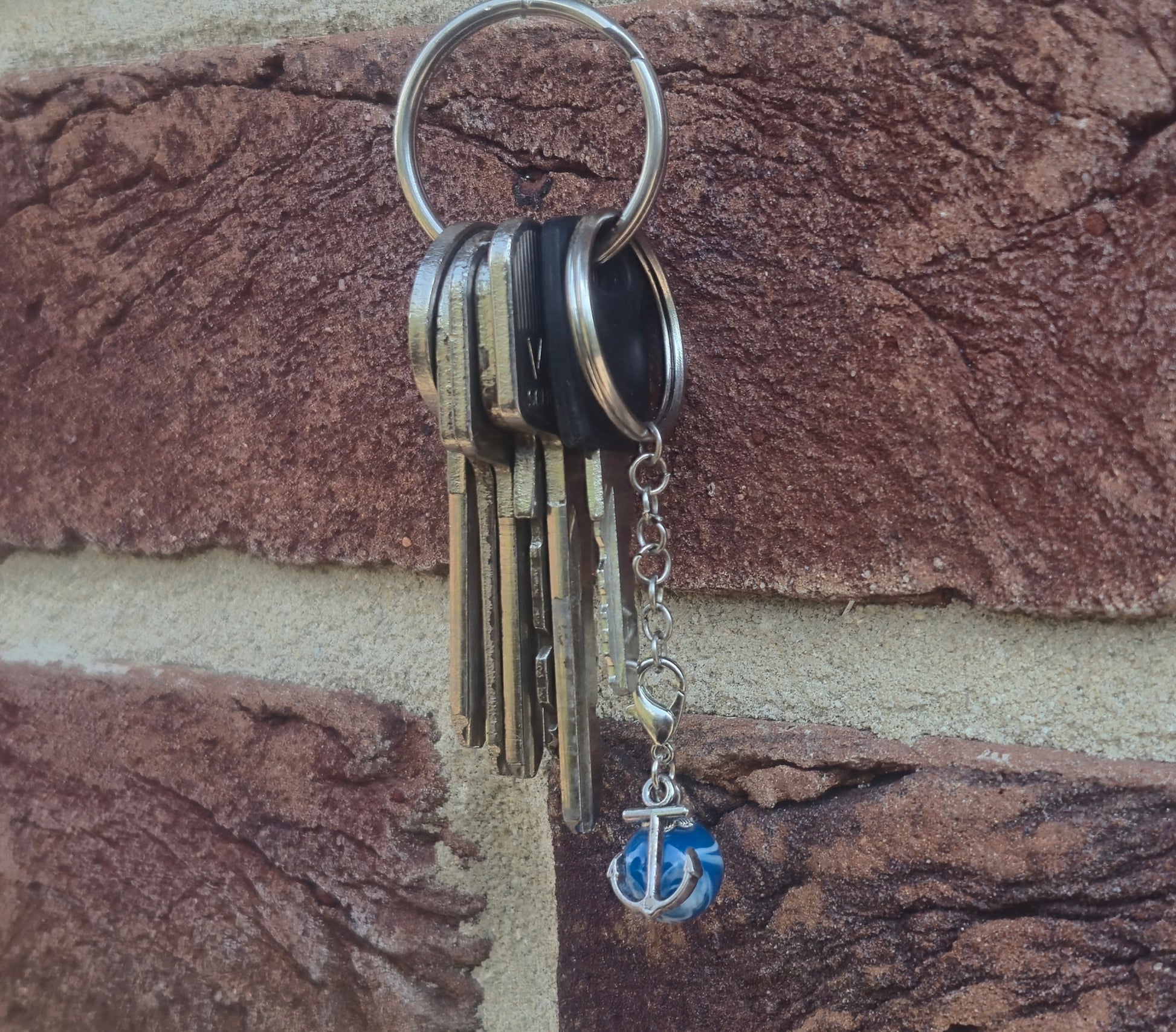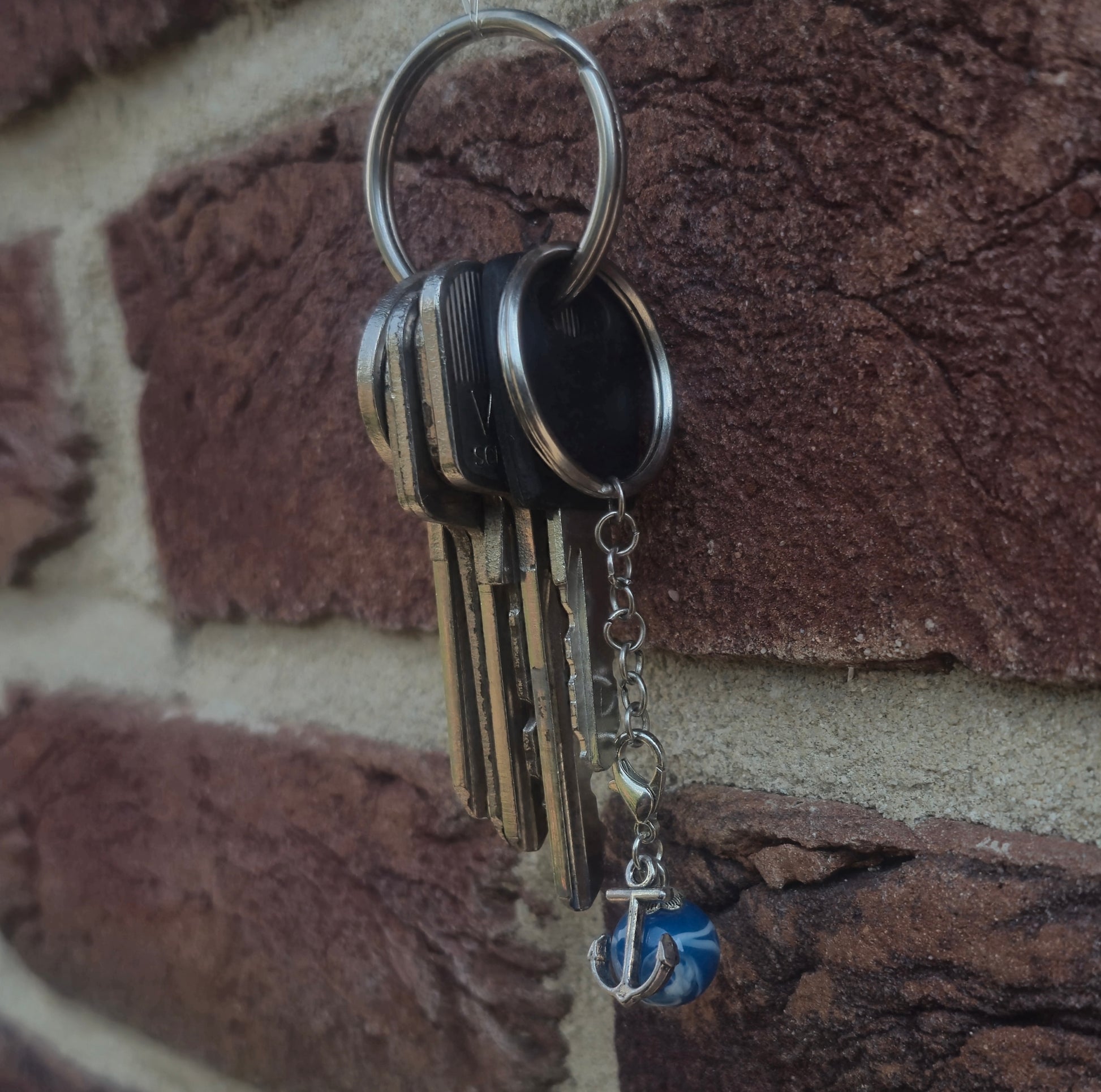 Blauer Taschenanhänger mit weißen Akzenten und Anker. Die silbernen Schlüsselanhänger gibt es unter dem Punkt Zubehör.