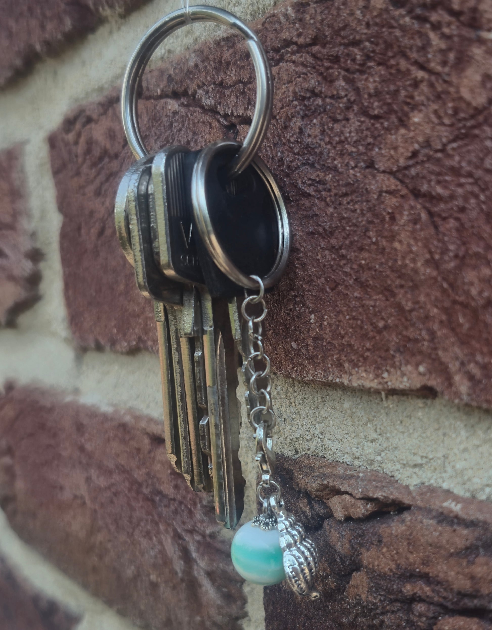 Weißer Taschenanhänger mit türkisgrünen Akzenten und Muschel Charm.Die silbernen Schlüsselanhänger gibt es unter dem Punkt Zubehör.