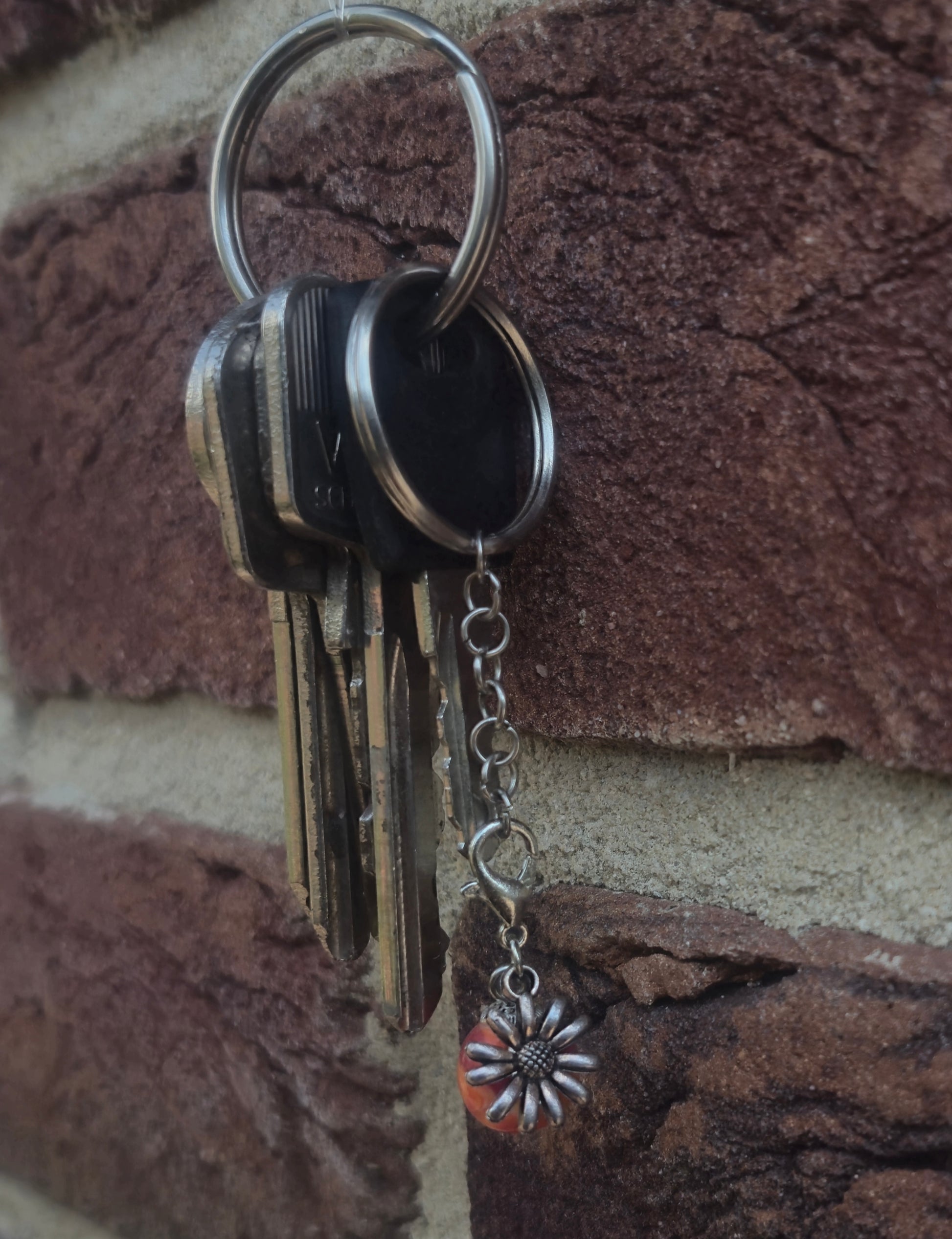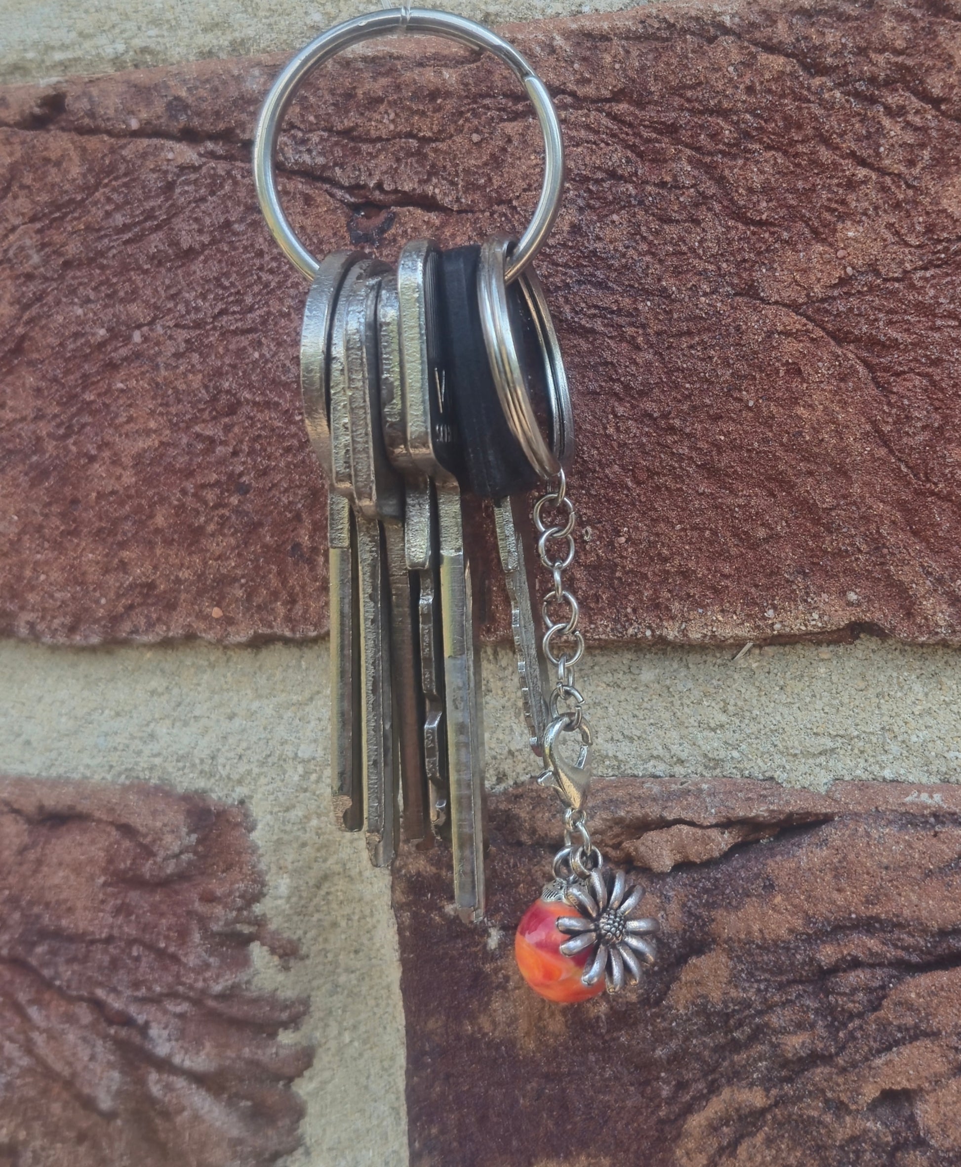 Rot orangener Taschenanhänger mit Blumen Charm.Die silbernen Schlüsselanhänger gibt es unter dem Punkt Zubehör.